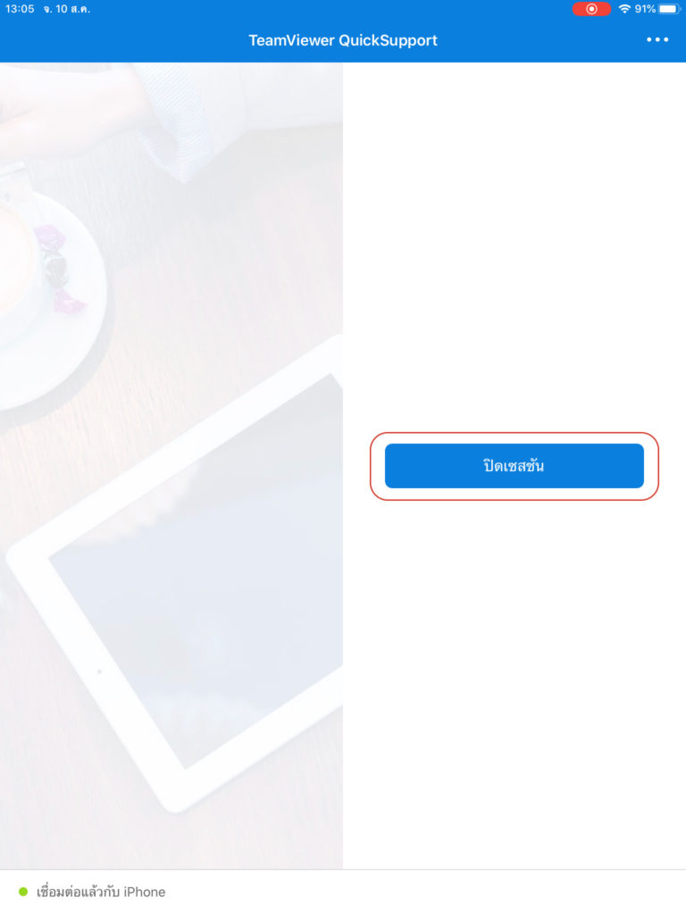 หากแชร์หน้าจอเรียบร้อยแล้ว ก็เข้าไปที่แอป TeamViewer QuickSupport แล้วเลือกปิดเซสชัน