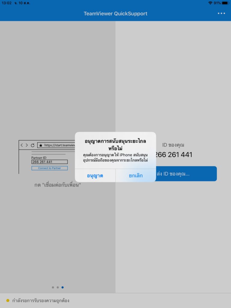 บน iPad ที่จะแชร์หน้าจอ ให้แตะอนุญาตการสนับสนุนระยะไกล