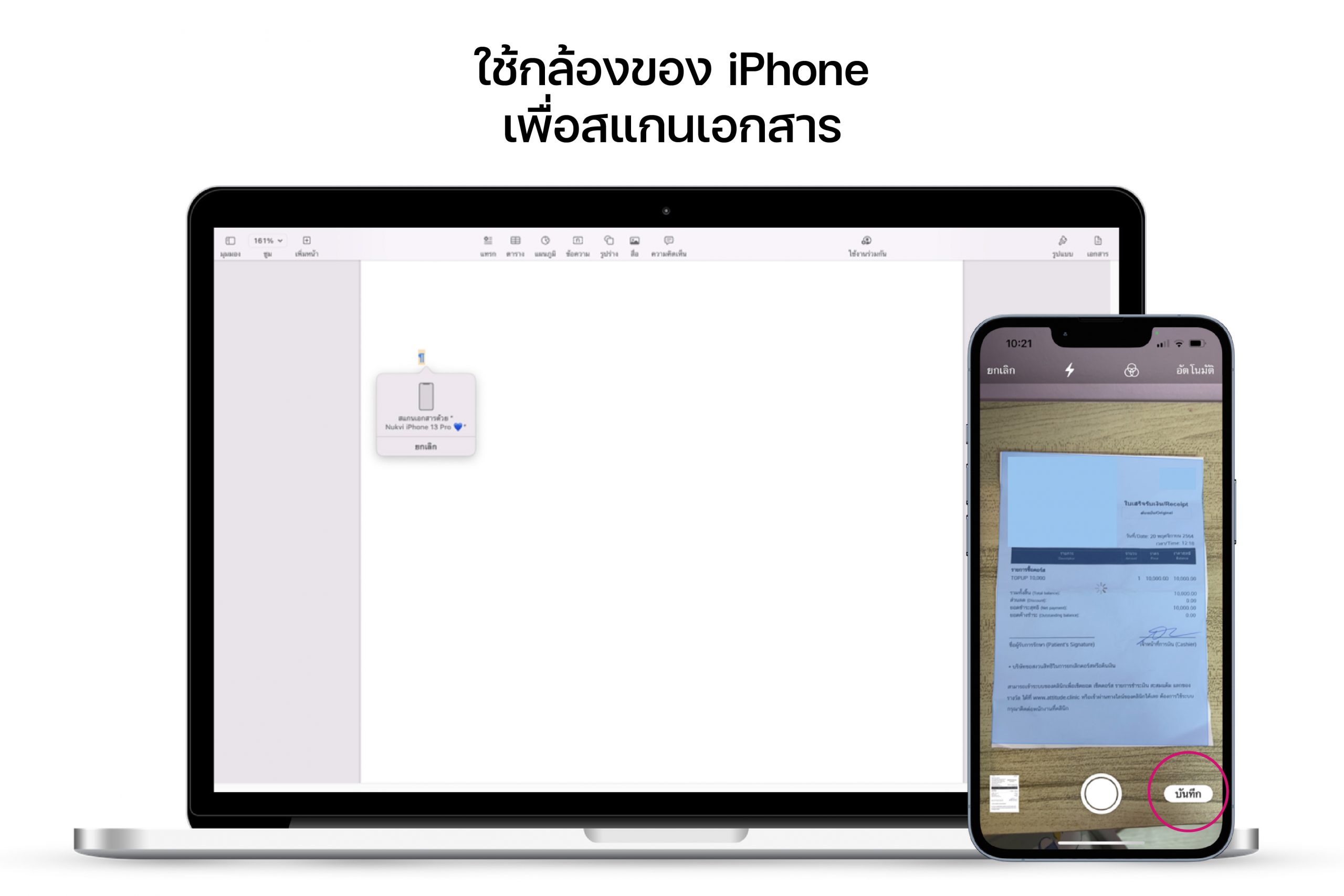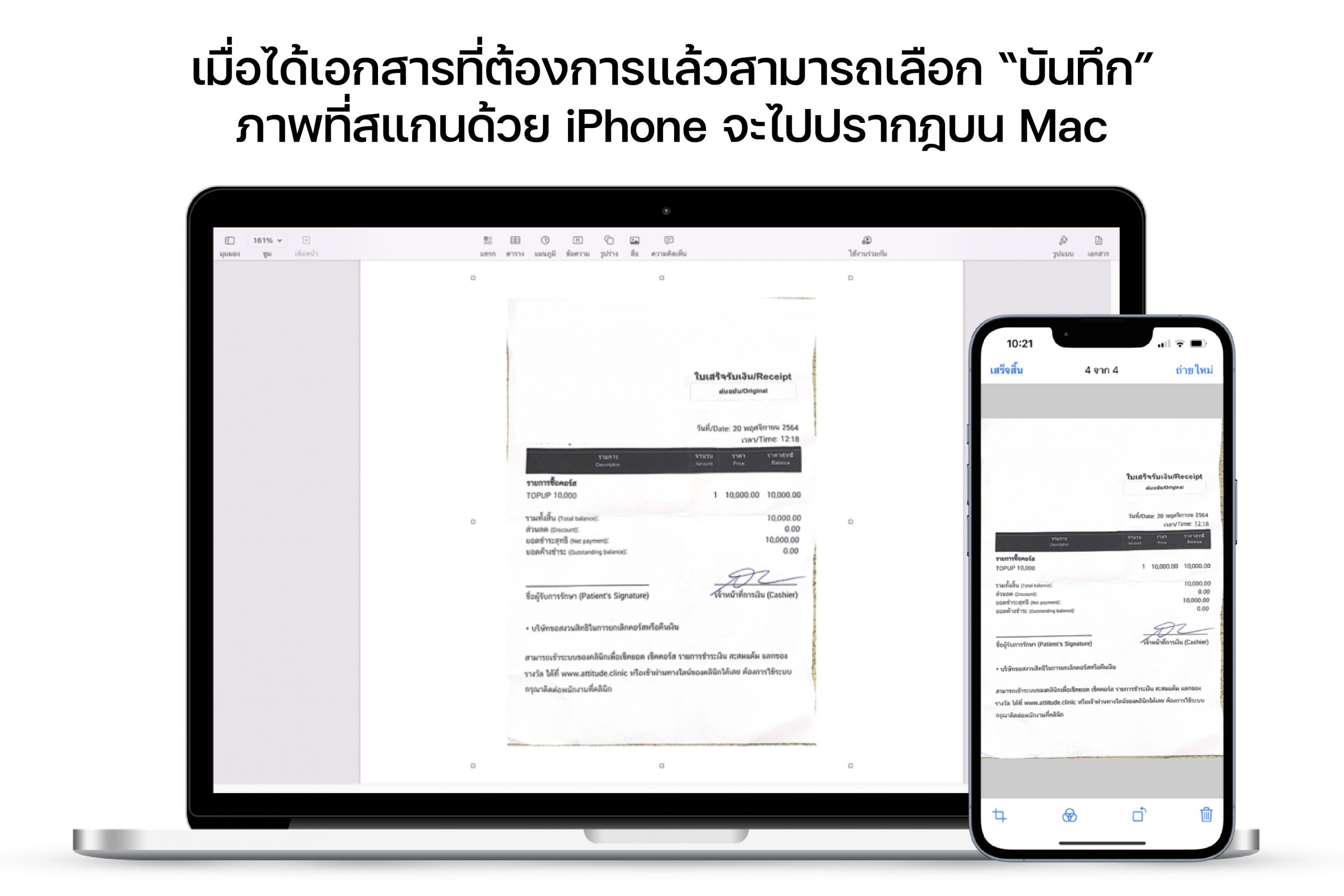 2. ขั้นตอนนี้หน้าจอของ Mac จะแสดงข้อความ “สแกนเอกสารด้วย iPhone” ขณะเดียวกัน iPhone ของเราจะเข้าโหมดสแกนเอกสารอัตโนมัติ ให้เราใช้กล้องของ iPhone ในการสแกนเอกสารได้เลย โดยในโหมดนี้จะตรวจจับเอกสารอัตโนมัติ และจะถูกเก็บตรงตำแหน่งซ้ายล่าง สามารถกดเข้าไปดูได้