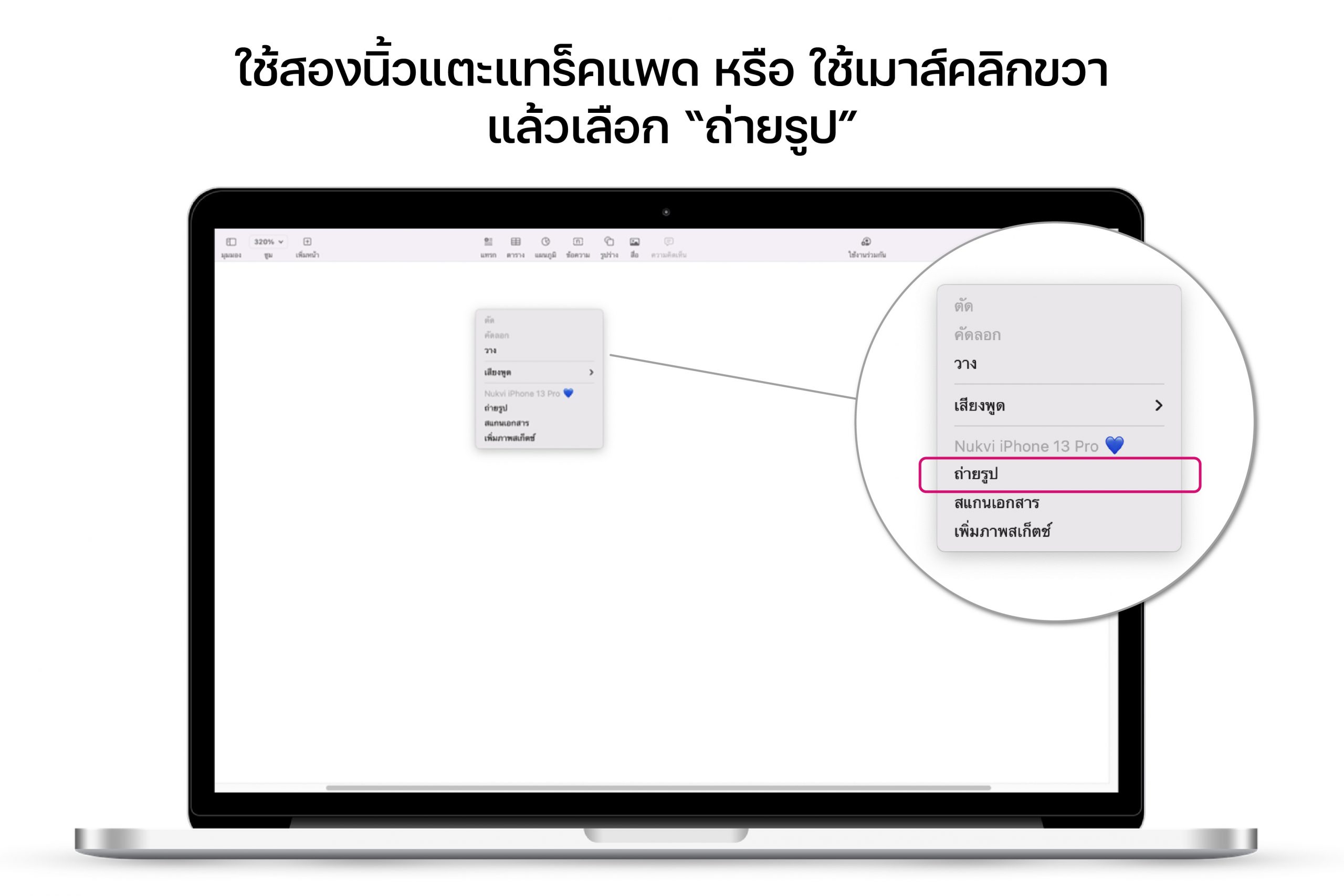 1. เปิด แอป iWork (Pages, Numbers, Keynote) ที่ต้องการใช้งาน บน Mac ใช้สองนิ้วแตะแทร็คแพด หรือใช้เมาส์คลิกขวา แล้วเลือก “ถ่ายรูป”