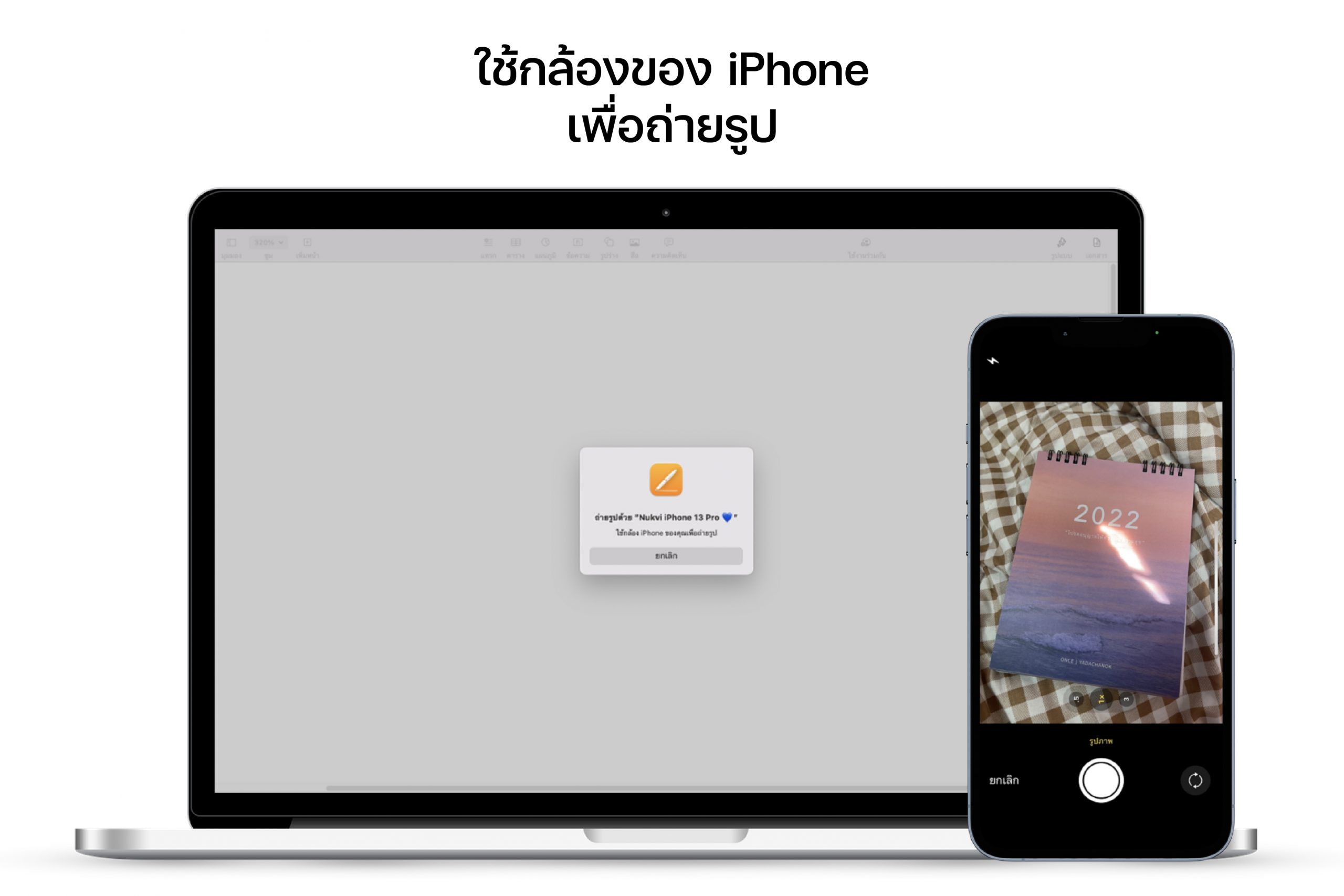 2. ขั้นตอนนี้หน้าจอของ Mac จะแสดงข้อความ “ถ่ายรูปด้วย iPhone ใช้กล้อง iPhone ของคุณเพื่อถ่ายรูป” ขณะเดียวกัน iPhone ของเราจะเข้าโหมดถ่ายรูปอัตโนมัติ ให้เราใช้กล้องของ iPhone ในการถ่ายรูปได้เลย