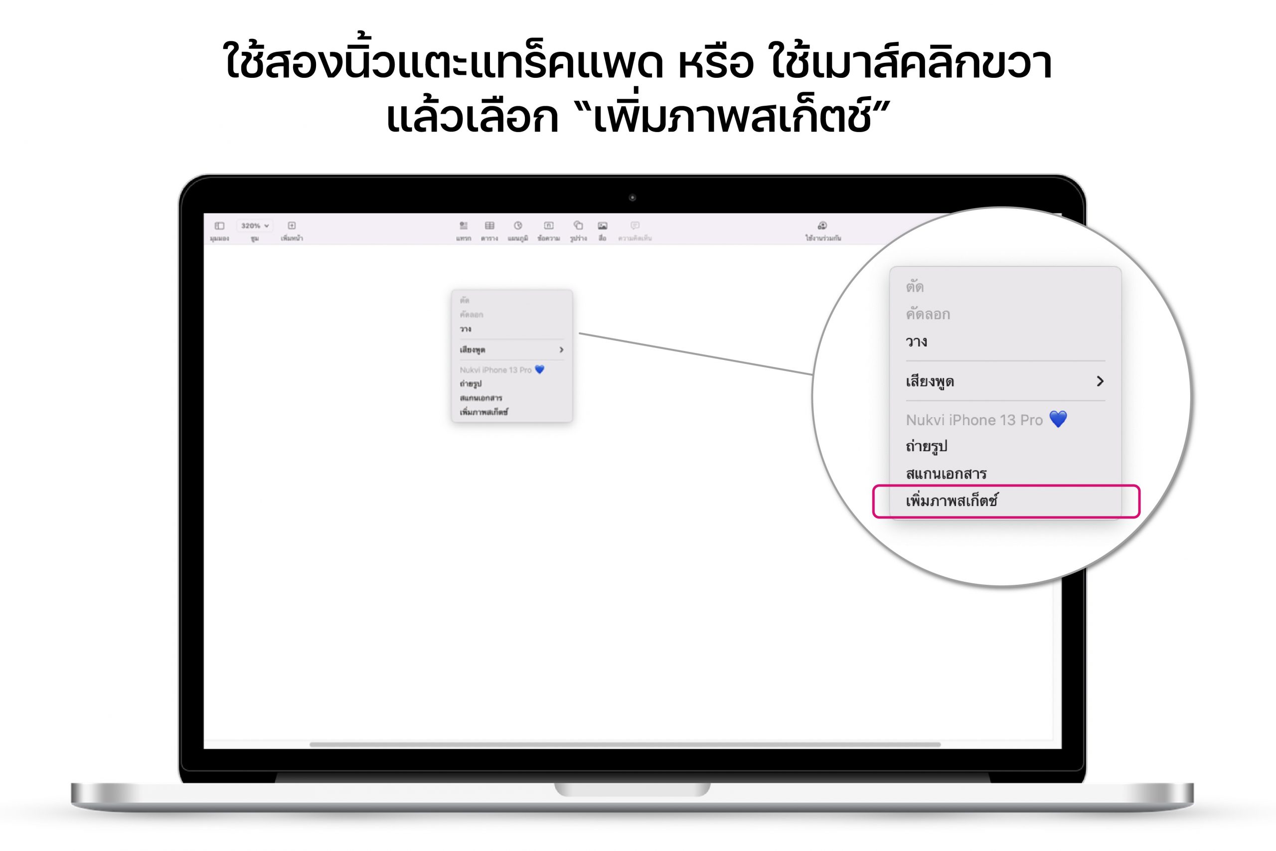 1. เปิด แอป iWork (Pages, Numbers, Keynote) ที่ต้องการใช้งาน บน Mac ใช้สองนิ้วแตะแทร็คแพด หรือใช้เมาส์คลิกขวา แล้วเลือก “สแกนเอกสาร”