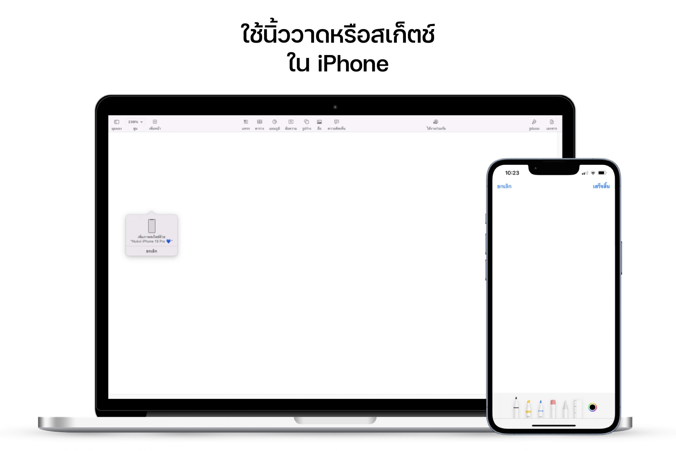 2. ขั้นตอนนี้หน้าจอของ Mac จะแสดงข้อความ “เพิ่มภาพสเก็ตช์ด้วย iPhone” ขณะเดียวกัน iPhone ของเราจะเข้าหน้าเพิ่มภาพสเก็ตช์อัตโนมัติ ให้ใช้นิ้ววาดลงบน iPhone ได้เลย สามารถเลือกบรัช ขนาดบรัช และสีได้