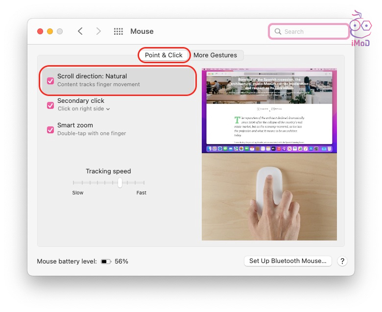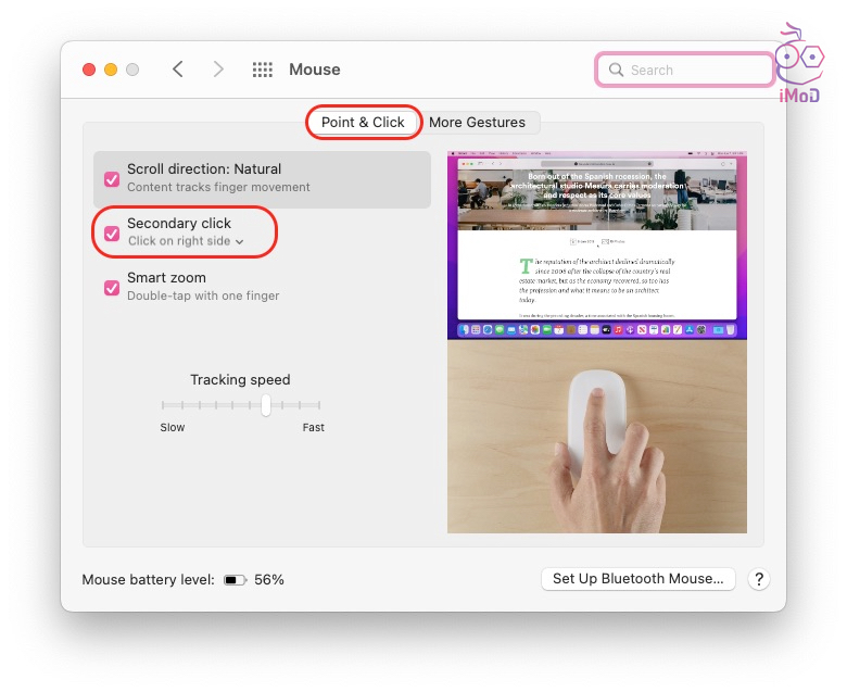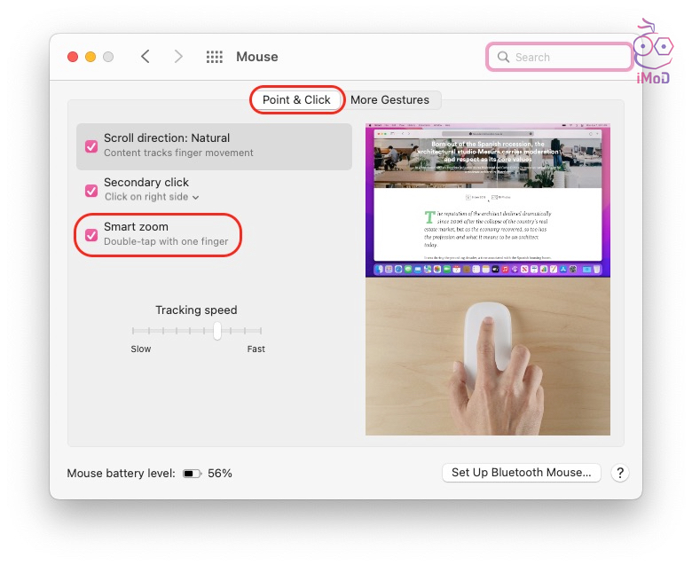 สามารถตั้งค่าเปิดหรือปิดใช้งานการซูมอัจฉริยะด้วย Magic Mouse ได้ที่ System Preferences > Mouse > แถบ Point & Click > เลือก Smart Zoom