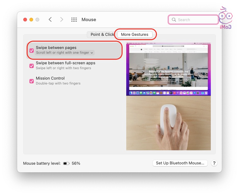 สามารถตั้งค่าเปิดหรือปิดกการปัดเพื่อเปลี่ยนหน้าด้วย Magic Mouse ได้ที่ System Preferences > Mouse > แถบ More Gestures > เลือก Swipe between pages