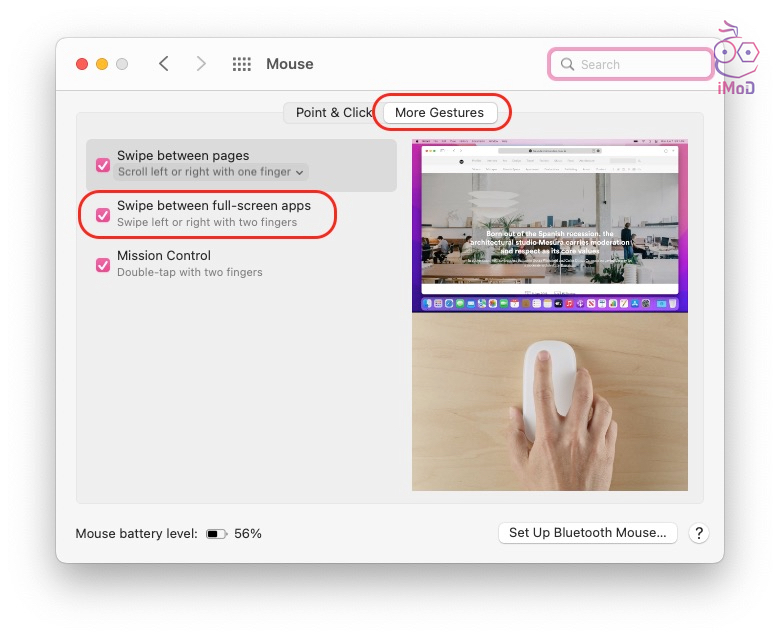 สามารถตั้งค่าเปิดหรือปิดการสลับแอปด้วย Magic Mouse ได้ที่ System Preferences > Mouse > แถบ More Gestures > เลือก Swipe between full-screen apps