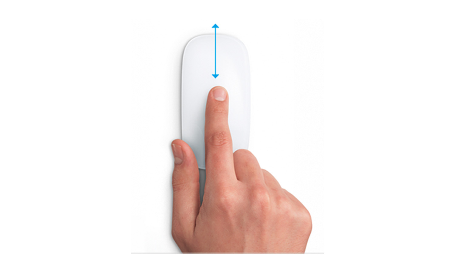 การเลื่อน Scroll ขึ้นหรือลง ใช้หนึ่งนิ้วเลื่อนที่ส่วนด้านบนของ Magic Mouse ขึ้นหรือลง เช่น เลื่อน Scroll Bar เวลาท่องเว็บไซต์
