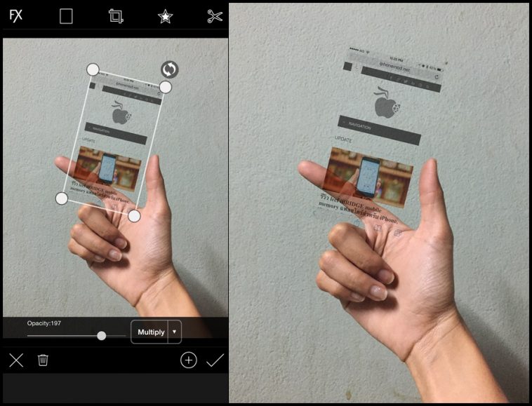 เลือกการปรับ Opacity เป็นแบบ Multiply จากนั้นก็ปรับความโปร่งใสตามที่ต้องการ โดยอาจมีการขยับเล็กน้อยเพื่อให้ได้องศาที่เหมาะสม