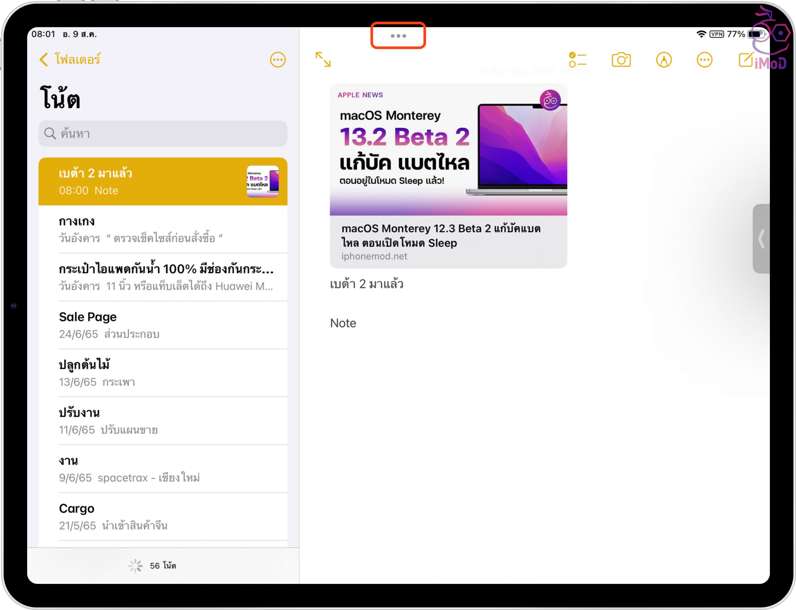 ให้เราเปิดแอปที่ต้องการ ดังตัวอย่างเปิดแอปโน้ต (Note) > แตะปุ่มมัลติทาสก์ ที่เป็นไอคอน 3 จุดด้านบน