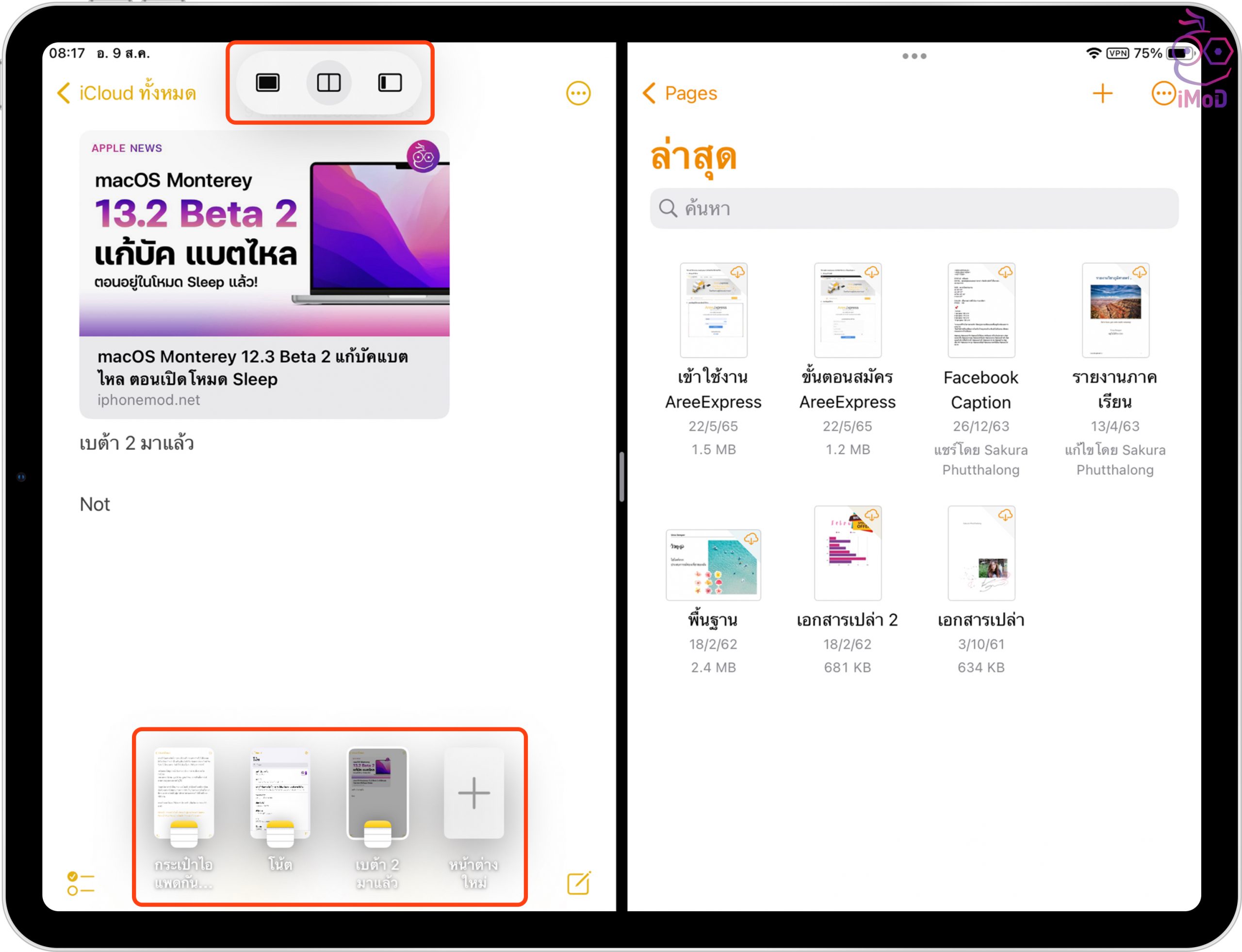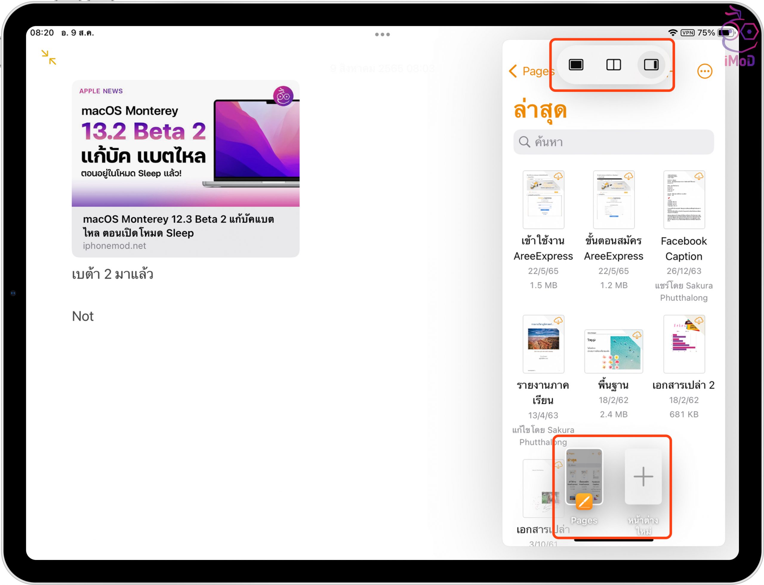 หน้าต่างแอปแรกก็จะถูกแสดงอยู่ด้านซ้ายมือ ให้เราเลือกเปิดอีกหนึ่งแอปที่ต้องการ ดังตัวอย่างเลือกเปิดแอป Pages
