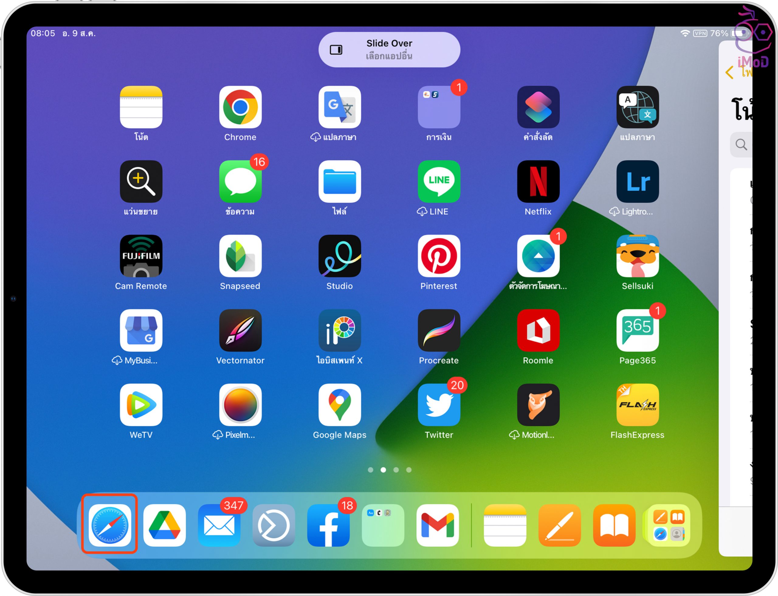 แอปแรกที่เราใช้งานก็จะถูกเปิดอยู่ทางด้านขวาของหน้าจอ ให้เราเลือกอีกหนึ่งแอปที่ต้องการเปิด ตัวอย่างเลือกเป็น Safari