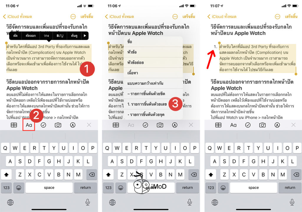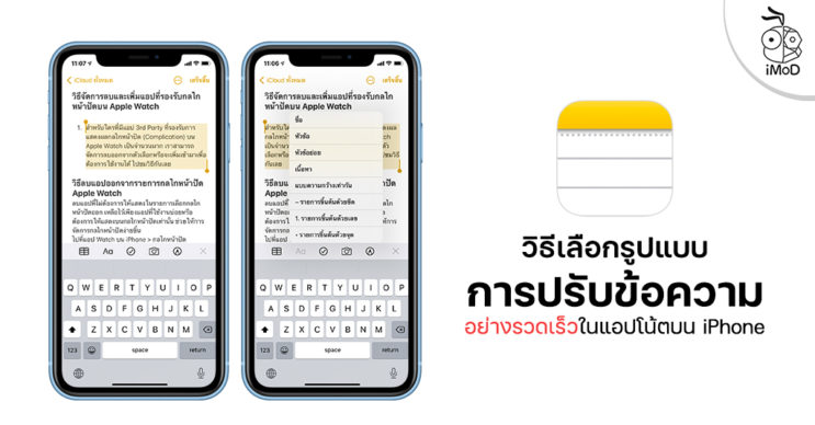 ไปที่แอปโน้ต (Note) > เลือกส่วนข้องความที่เราต้องการปรับแต่ง > แตะไอคอน AA ค้างไว้ > เราจะเห็นเมนูการปรับแต่งข้อความอย่างรวดเร็ว เลือกเมนูที่ต้องการ ดังตัวอย่างเลือกเป็น > ข้อความส่วนที่เลือกก็จะถูกเปลี่ยนตามรูปแบบที่เราเลือก