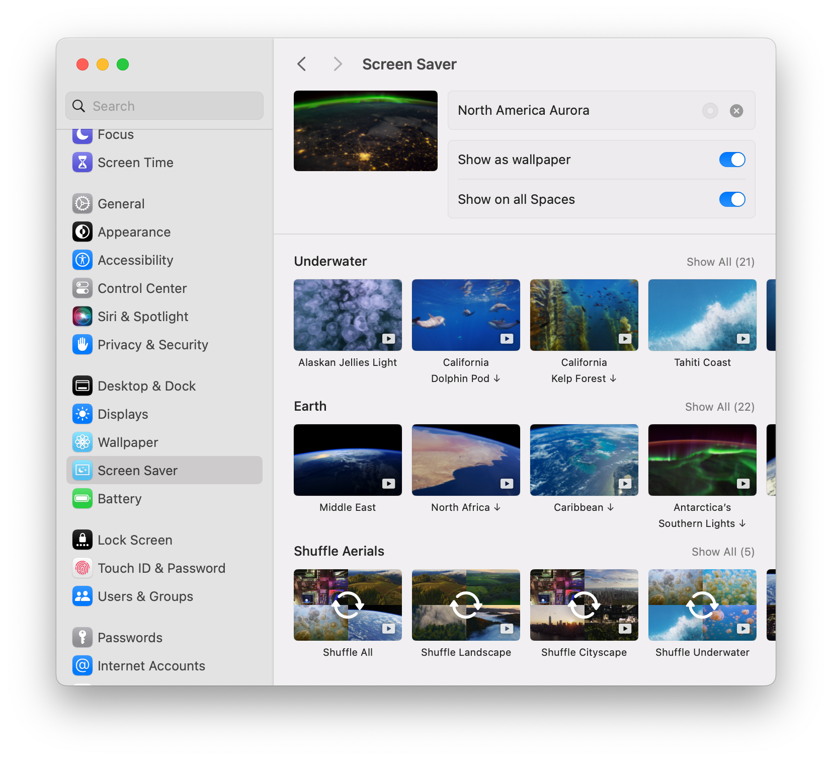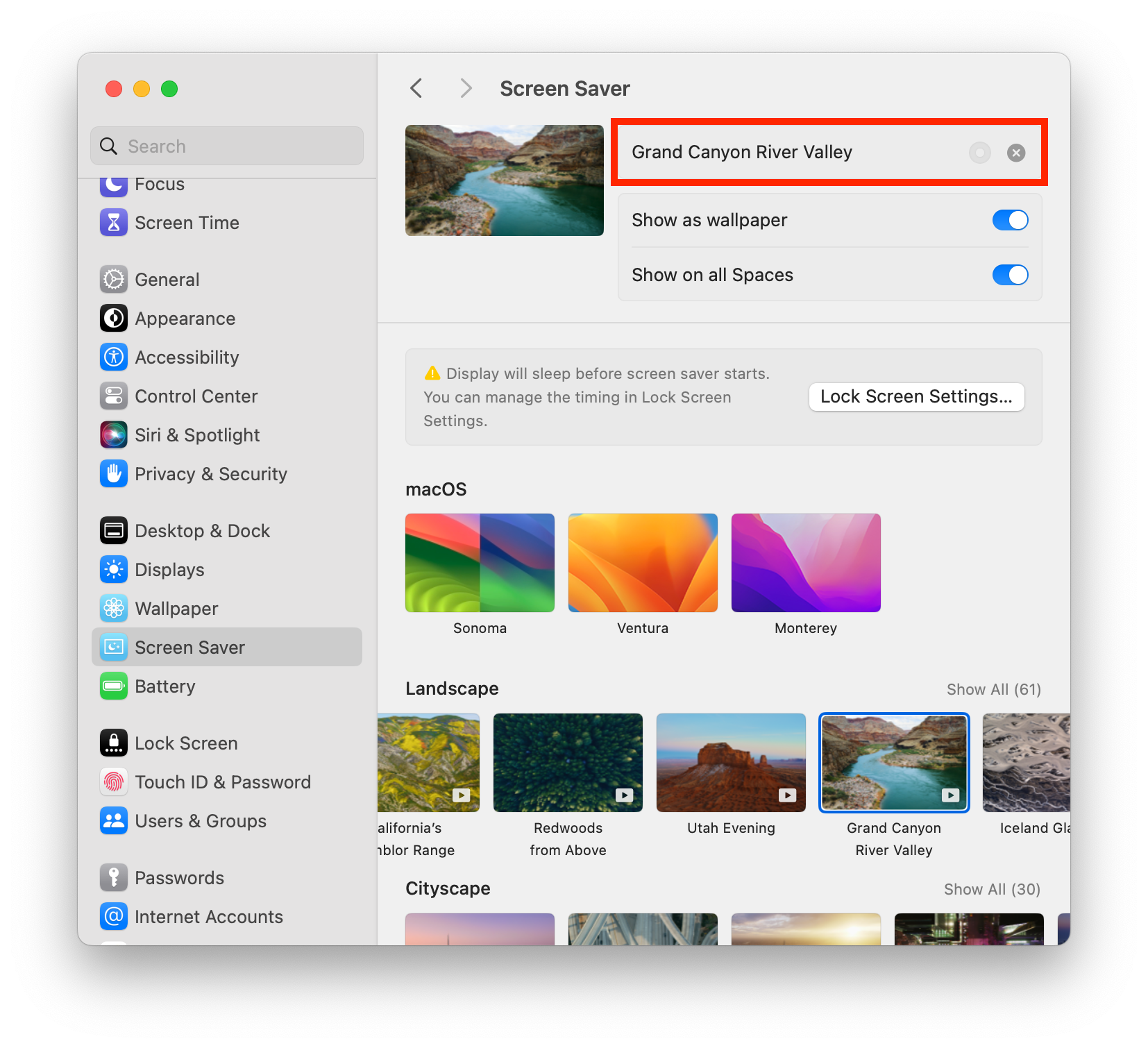 สกรีนเซฟเวอร์ใหม่ใน macOS Sonoma เป็นแบบสโลว์โมชั่นมีภาพสวยงามให้เลือกเยอะ หลายหมวดหมู่ ได้แก่ ภาพวอลเปเปอร์ของ maaOS, Landscape, Cityscape, Underwater, Earth, วอลเปปอร์แบบสุ่ม โดยเมื่อเราล็อกอินภาพ Screen Saver ก็จะเปลี่ยนเป็นภาพพื้นหลังบนเดสก์ท็อปให้เลยแบบต่อเนื่อง