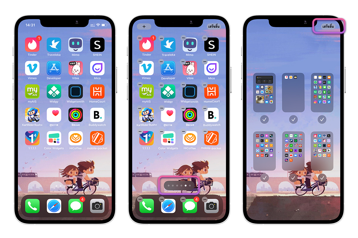 - ตรวจสอบว่าหน้าจอโฮมทั้งหมดถูกเปิดแล้ว จากนั้นแตะ เสร็จสิ้น ที่มุมขวา