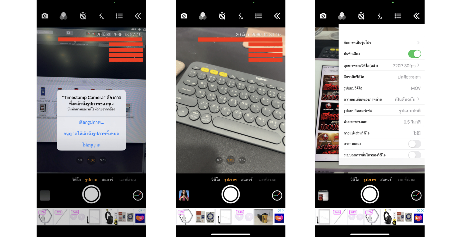 แอปนี้พอเข้ามา ตัวแอปจะให้การอนุญาตการเข้าถึงรูปภาพ ให้เรากดอนุญาติให้ถึงเข้ารูปภาพทั้งหมด จากนั้นให้เราเลือกรูปหรือถ่ายภาพที่เราต้องการได้เลย โดยที่ตัวแอปสามารถปรับคุณภาพของภาพและวิดีโอที่ต้องการถ่ายได้เลย ถ้าเราถ่ายรูปเสร็จแล้วตัวแอปจะทำ Timestamp ตามวัน เวลา และที่อยู่ของเราที่ขึ้นบนหน้าจอก่อนถ่าย