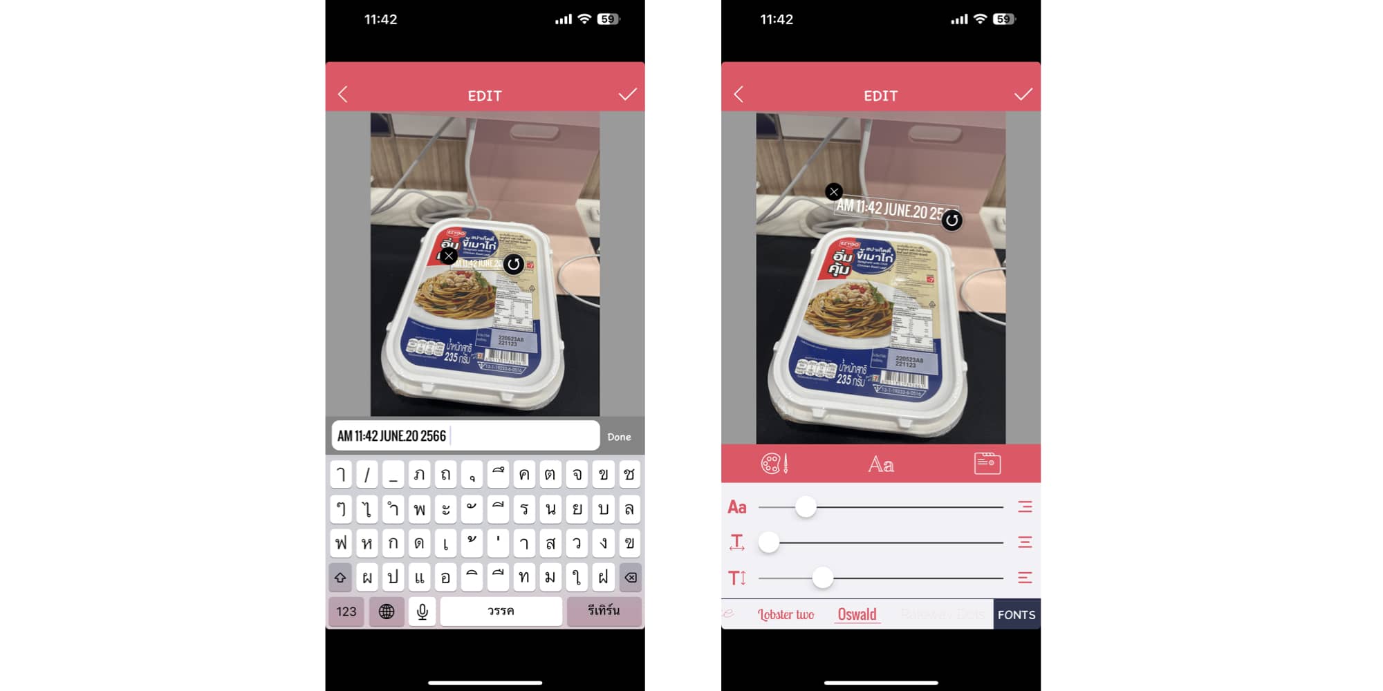 จากนั้นตัวแอปจะพิมวันที่ให้เราอัตโนมัติเลย หรือถ้าเราต้องการจะแก้ไขวันที่และเวลาก็สามารถแก้ได้ โดยที่เรานั้นสามารถปรับขนาดตัวอักษรและสีได้อีกด้วย