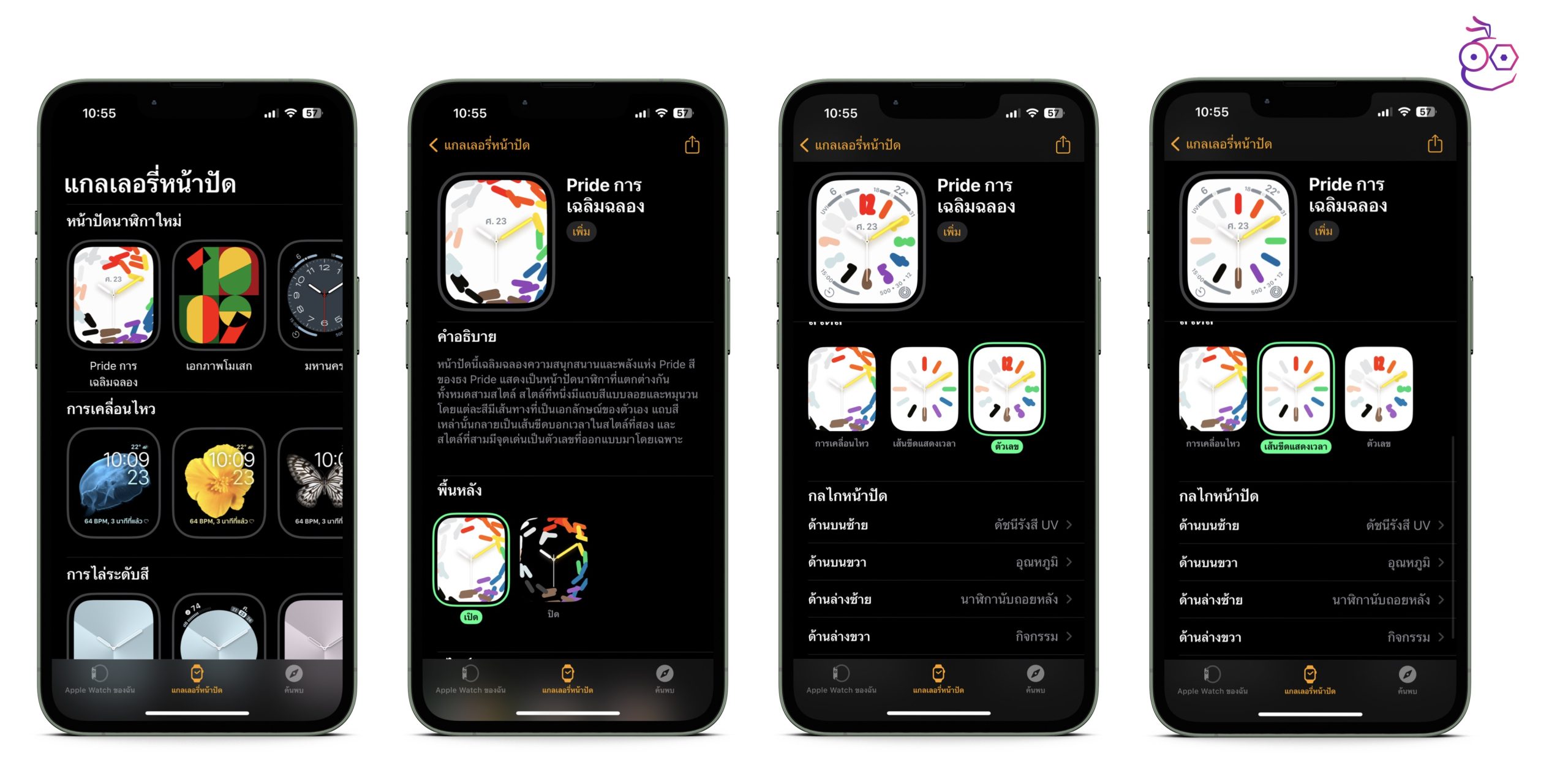- หน้าปัด Apple Watch ใหม่ Pride Celebration ที่มีตัวเลือกการปรับแต่งทั้งหมด 3 สไตล์ (การเคลื่อนไหว, ตัวเลข)