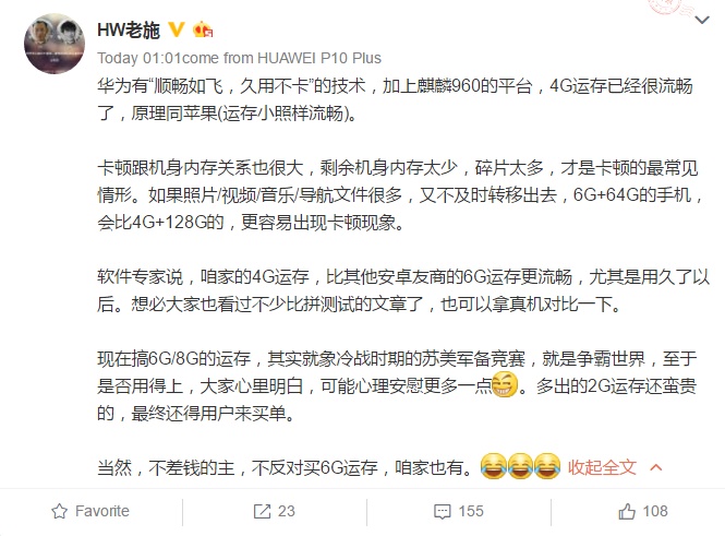 ผู้บริหาร Huawei ได้โพสต์ข้อความผ่าน Weibo (@HW  Lao Shi) เพื่อแสดงความเห็นเกี่ยวกับสมาร์ทโฟนที่มี RAM ขนาดใหญ่ โดยเขามองว่า 4GB ก็เพียงพอสำหรับการใช้งานที่ราบรื่น โดยจากการทดสอบของ Huawei จับคุ่กับ Kirin 960 พร้อมกับ RAM 4GB ยังสามารถทำงานได้ดีกว่าสมาร์ทโฟน RAM 6GB เสียอีก !!!