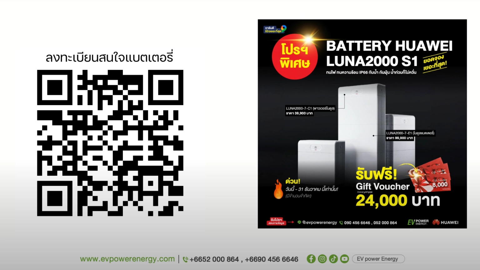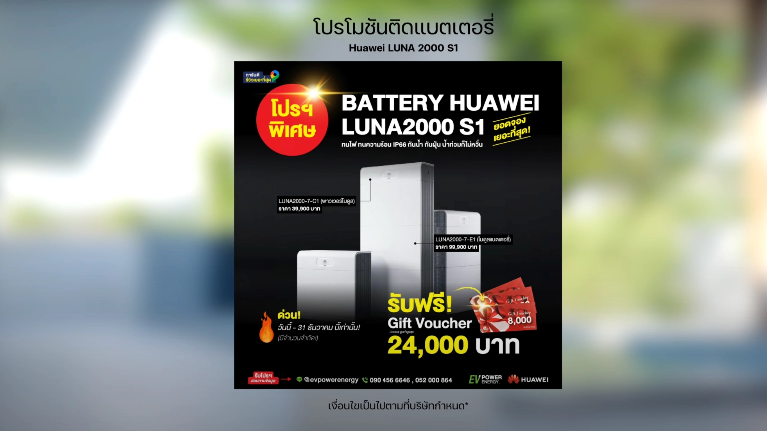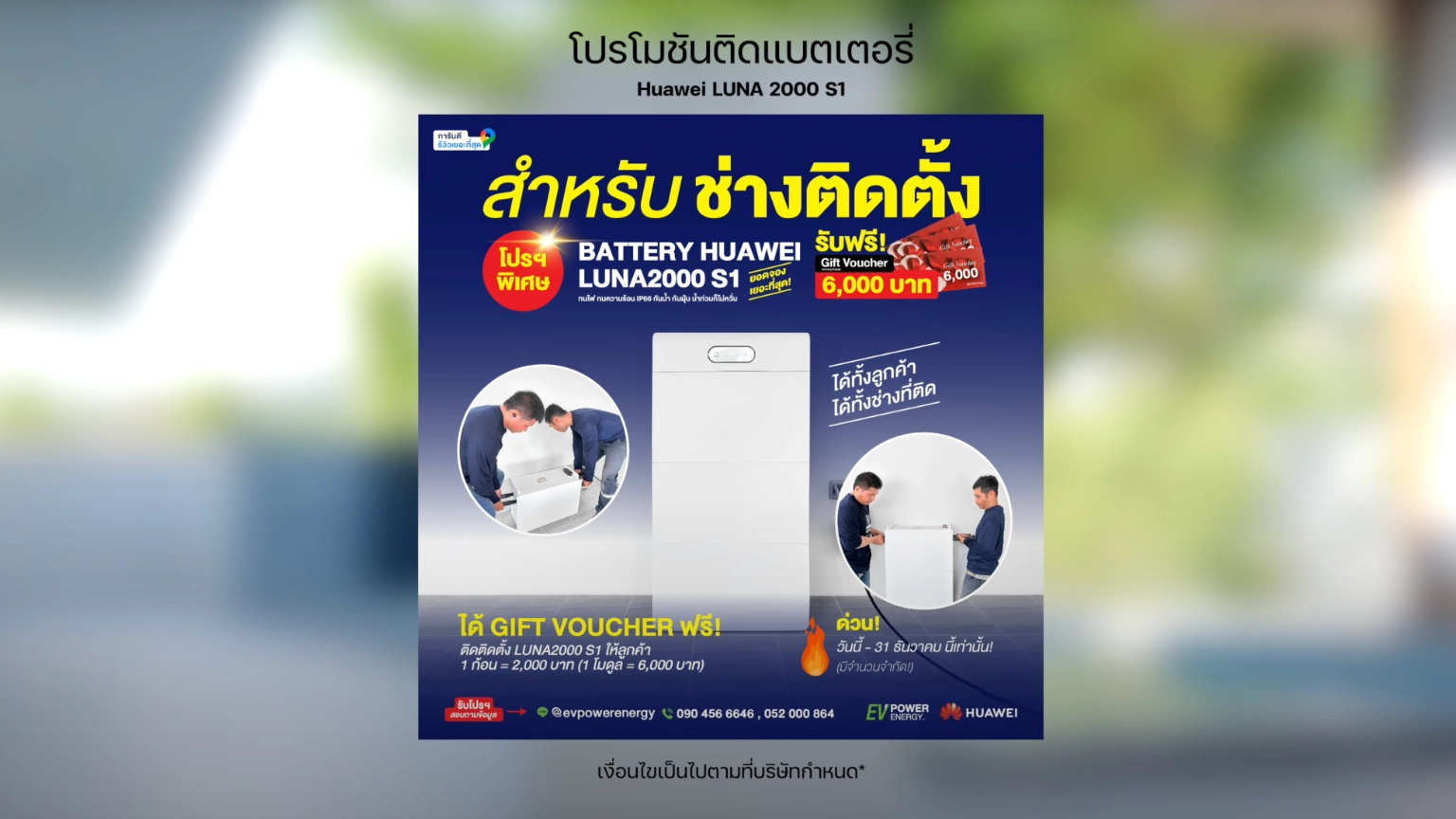 - กลุ่มลูกค้าเดิมที่มี Inverter ของทาง Huawei ที่พร้อมสำหรับการมีเเบตเตอรี่ รับฟรี Gift Voucher มูลค่าถึง 8,000 บาท/ก้อน
