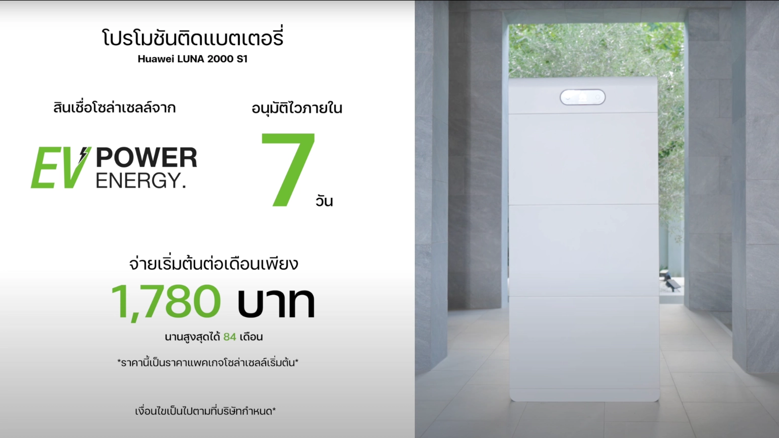 นอกจากนี้ทาง EV POWER ENERGY มีโปรโมชันสุดพิเศษในการขอสินเชื่อเพื่อให้ได้เป็นเจ้าของ Huawei LUNA 2000 S1 อนุมัติภายใน 7 วัน จ่ายชำระเริ่มต้นเเค่ ฿1,780/เดือน *นานสูงสุดถึง 84 เดือน