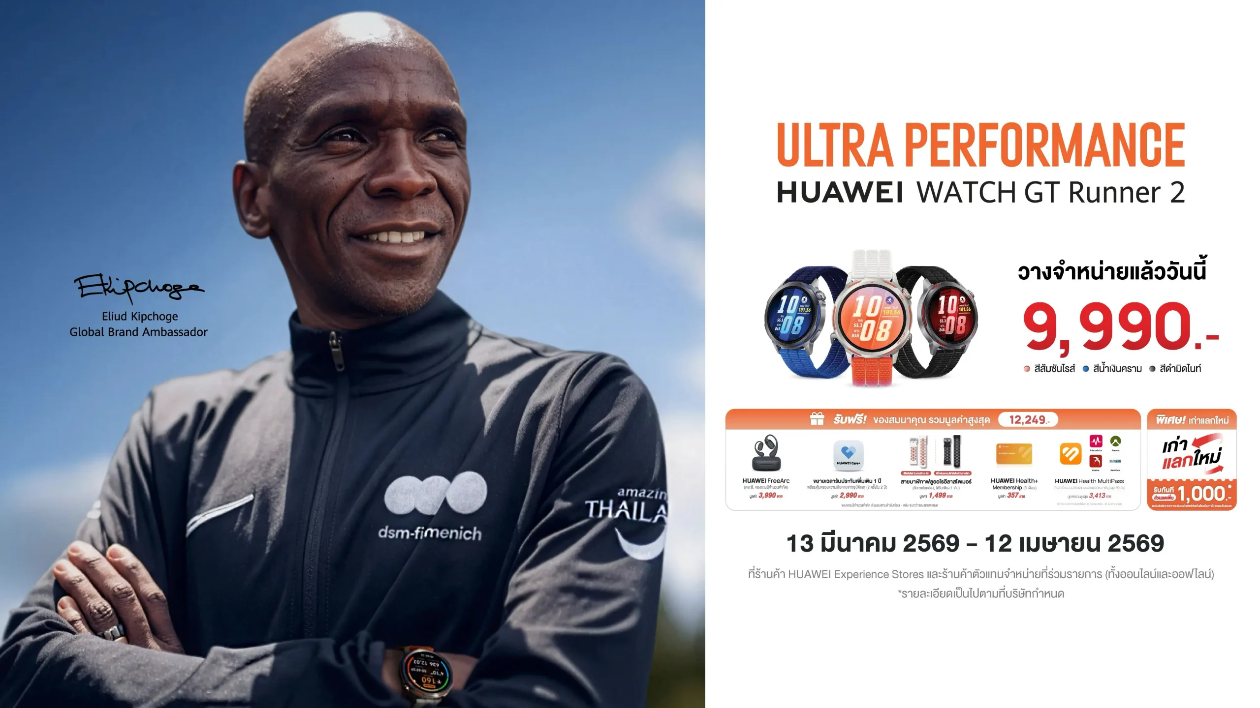 HUAWEI WATCH GT Runner 2 สมาร์ทวอทช์ที่เข้าใจทั้งจังหวะการเคลื่อนไหว และจังหวะชีวิต วางจำหน่ายแล้วในราคา 9,990 บาท พิเศษ! รับทันทีของสมนาคุณมูลค่ารวมสูงสุดกว่า 12,249 บาท ได้แก่ หูฟัง HUAWEI FreeArc (คละสี จำนวนจำกัด) มูลค่า 3,990 บาท, สิทธิ์ HUAWEI Care+ ขยายเวลารับประกันเพิ่มเติม 1 ปี