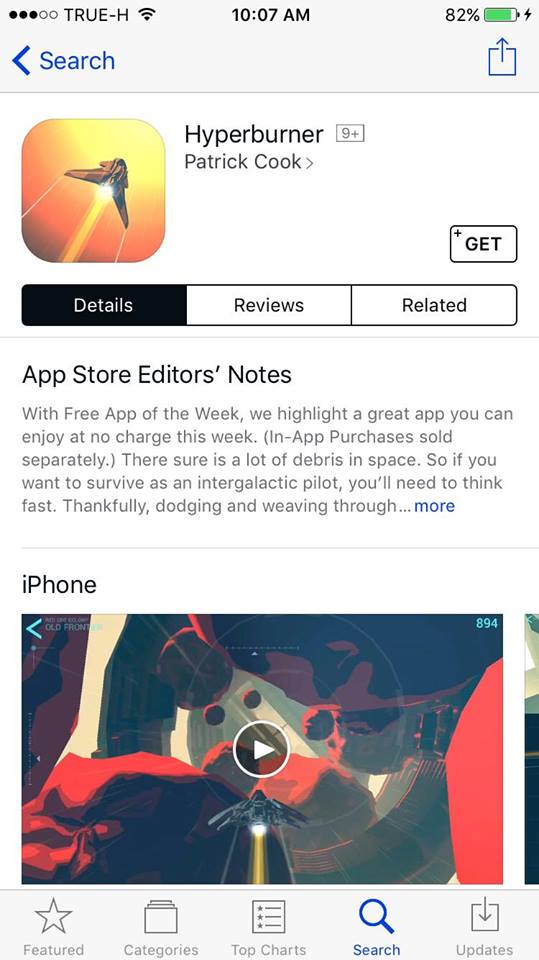 Apple เลือกให้เกม Hyperburner เป็นแอปฟรีประจำสัปดาห์ โดยเกมนี้เป็นเกมที่ให้ผู้เล่นบังคบยานอวกาศให้หลบหลีกสิ่งกีดขวางไปยังที่หมายตามเวลาที่กำหนด ซึ่งแต่ละด่านจะมีความยากง่ายตามระดับที่สูงขึ้น เมื่อเล่นผ่านไปหลายด่านก็จะสามารถปลดล็อค Zone และด่านเพิ่มเติม รวมไปถึงยานอวกาศที่มีความเร็วสูงขึ้นได้