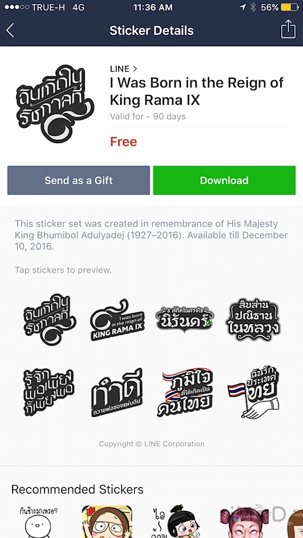 LINE แจกสติกเกอร์ฟรีลาย ฉันเกิดในรัชกาลที่ 9 หรือ I Was Born in the Reign of King Rama IX เพื่อแสดงความรำลึกถึงรัชกาลที่ 9 ที่พระเสด็จสู่สวรรคาลัยไปเมื่อวันที่ 13 ตุลาคม 2559 ที่ผ่านมา ผู้ใช้งาน LINE ในประเทศไทย(ที่ลงทะเบียนเบอร์โทร) สามารถดาวน์โหลดได้ฟรีที่ Sticker Shop ได้ตั้งแต่วันนี้ถึงวันที่ 10 ธันวาคม 2559 นี้