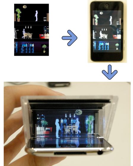 เกริ่นกันมาเยอะแล้ว มาดูรายละเอียดของ i3DG กันบ้างดีกว่า ความลับของการสร้างภาพ 3D ของอุปกรณ์เสริมตัวนี้ก็คือ “กระจกใส” โดยตัวอุปกรณ์จะประกอบด้วยกระจก 3 อันวางซ้อนเรียงกัน ทำมุม 45 องศา เมื่อสวมเข้ากับ iPhone (หรือ iPad เนื่องจากทางผู้สร้างมีแผนที่จะทำอันใหญ่ออกมาด้วย) ภาพวิดีโอเกมส์ที่แสดงบนหน้าจอ iPhone จะสะท้อนขึ้นไปบนกระจกทั้ง 3 ชิ้น ทำให้ผู้ใช้มองเห็นภาพที่ปรากฎมีระยะลึกตื้นต่างกันตามระยะห่างของกระจกนั่นเอง ลองชมคลิปตามข้อมูลข้างล่างนี้ดูนะคะ รับรองต้องทึ่งกับไอเดีย gadget ชิ้นนี้กันอย่างแน่นอนเลยทีเดียว ^^