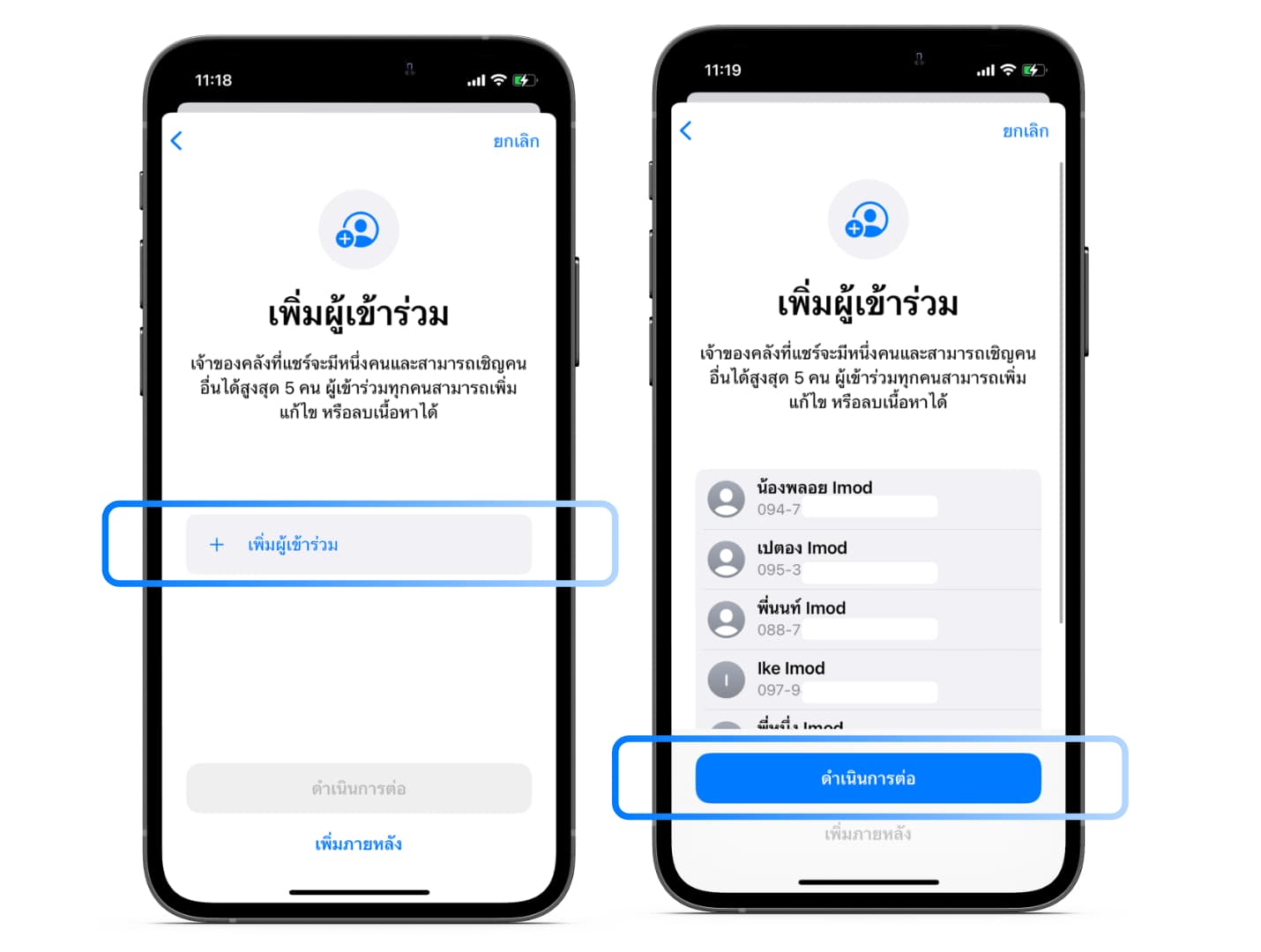 เพิ่มผู้เข้าร่วมที่เราอยากจะแชร์อัลบั้มด้วย โดยสามารถเพิ่มได้จากรายชื่อผู้ติดต่อที่อยู่ในเครื่อง