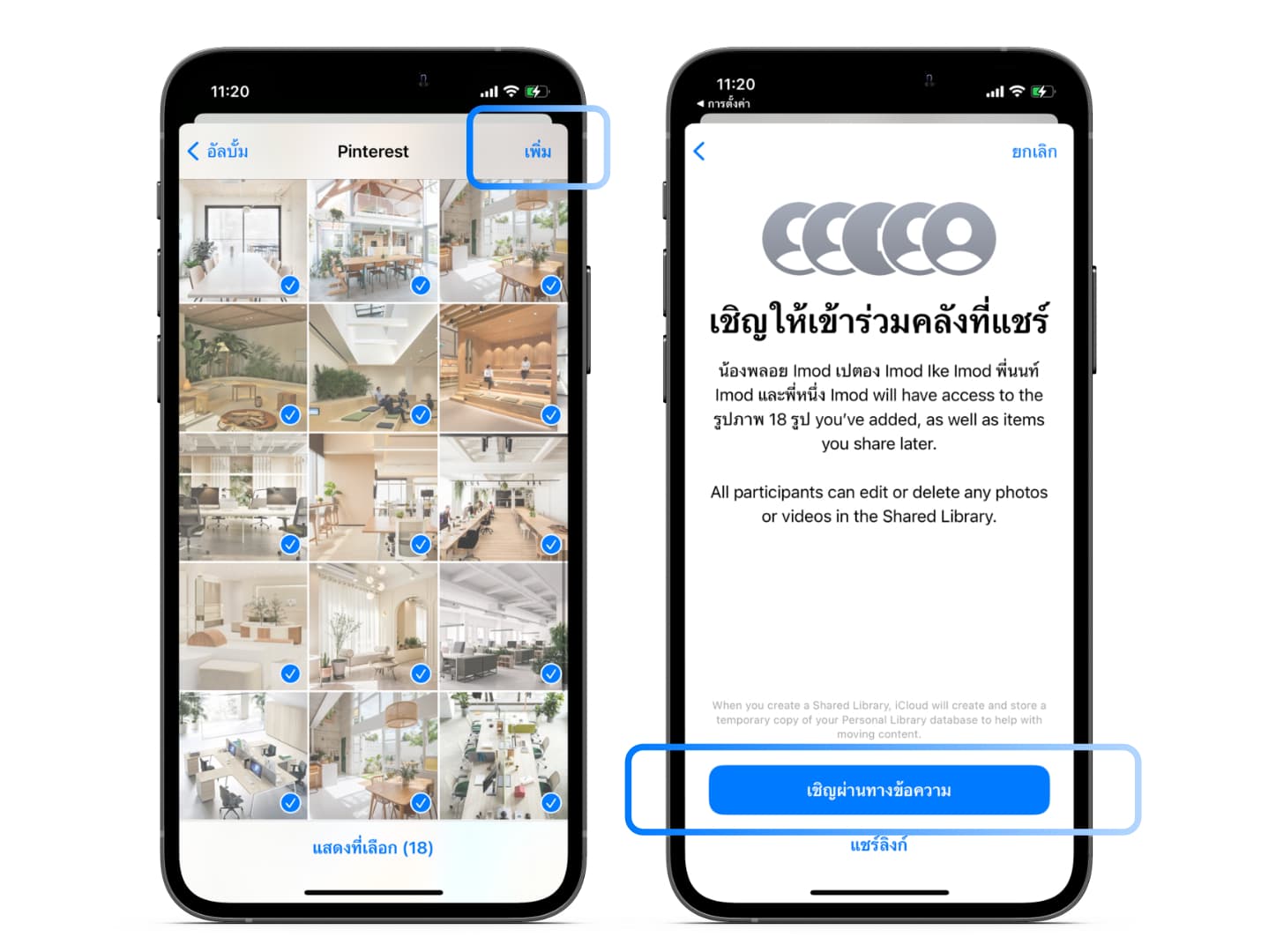 เมื่อเลือกรูปภาพเสร็จแล้ว แตะ “เพิ่ม” > เชิญผู้คนที่เลือกมาแชร์อัลบั้มด้วยกันผ่านทางข้อความ
