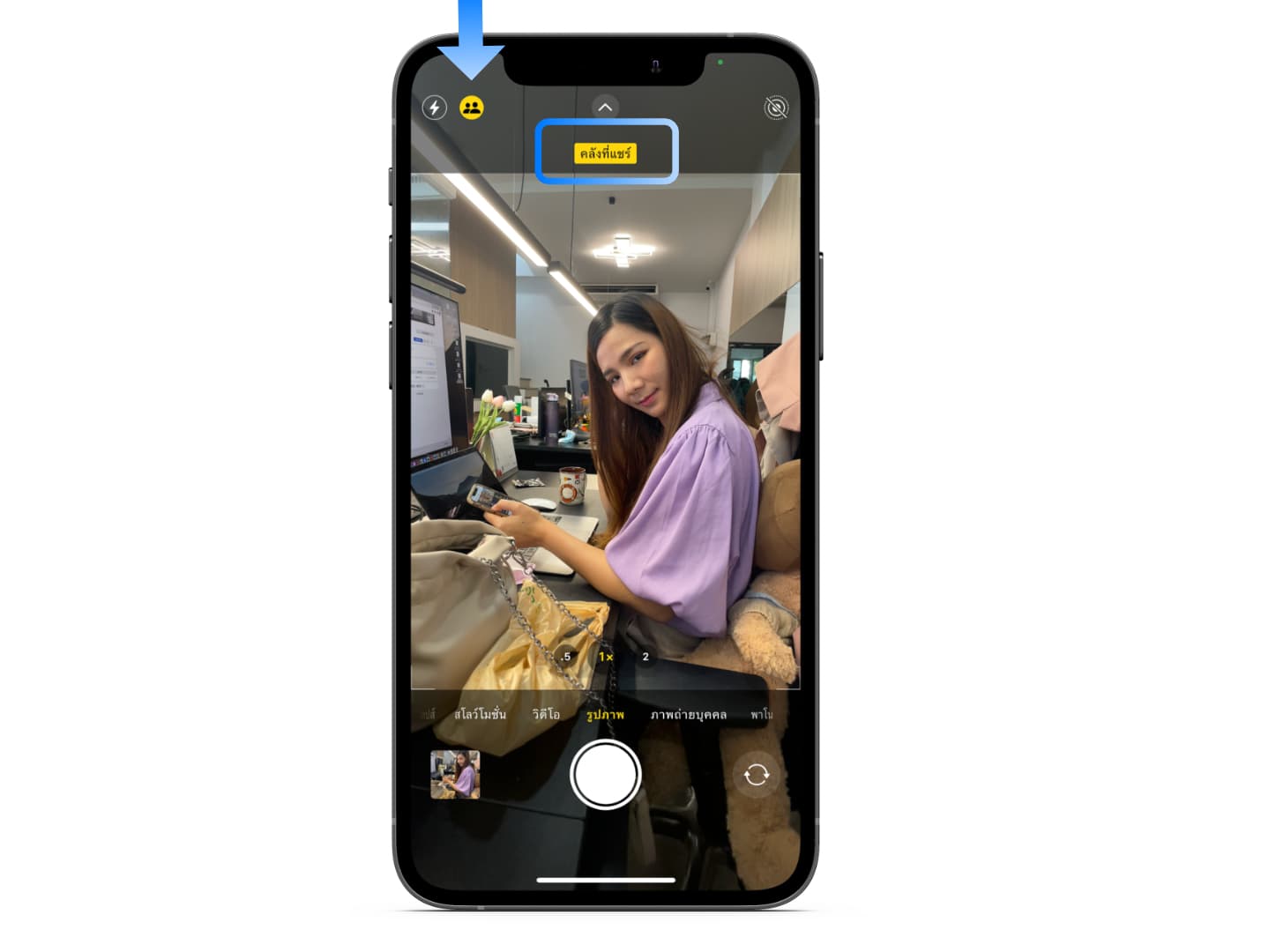 ฟีเจอร์นี้จะสามารถใช้งานจากแอปกล้องโดยตรงได้ด้วย เวลาที่เราจะกดถ่ายภาพ จะมีสัญลักษณ์คลังที่แชร์ปรากฏ เมื่อเรากดถ่ายภาพ รูปภาพที่เราถ่ายจะถูกเก็บไว้ในคลังรูปภาพที่แชร์ให้ทันที