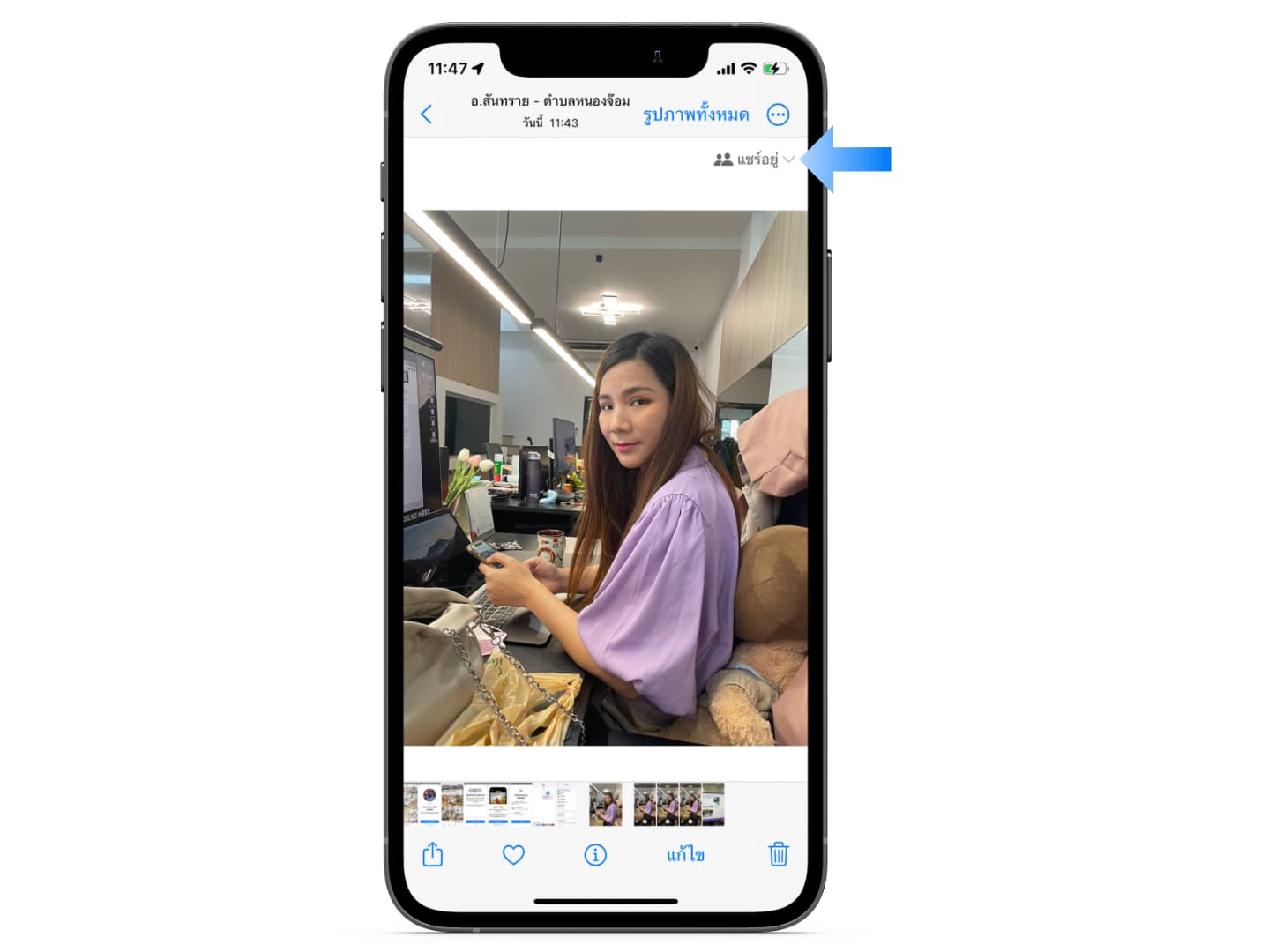 ในคลังรูปภาพ เมื่อเรากดดูรูปภาพใดรูปภาพหนึ่ง เราจะพบสัญลักษณ์การแชร์ ที่เขียนว่า “แชร์อยู่” แปลว่ารูปภาพรูปนั้นถูกแชร์ในอัลบั้ม “คลังรูปภาพ iCloud ที่แชร์”