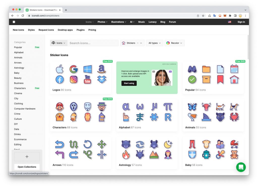 เว็บไซต์ https://icons8.com/ มีไอคอนสวย ๆ เยอะมากมายหลายประเภทให้เลือกดาวน์โหลด สามารถเลือกรูปแบบของไอคอนก่อนที่จะดาวน์โหลดได้ เว็บนี้มีไอคอนที่ดูสวยโดดเด่นมาก ๆ สำหรับผู้ใช้ฟรีอาจถูกจำกัดฟอร์แมทและขนาดนะคะ