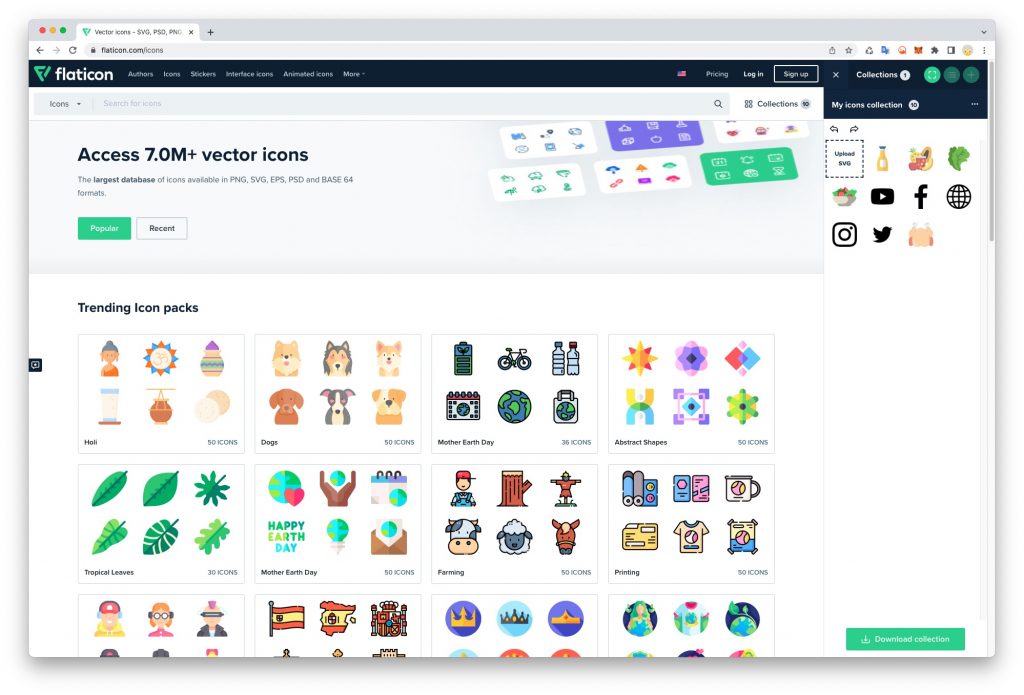 เว็บไซต์ https://www.flaticon.com/ เป็นแหล่งของไอคอนที่มีให้ไอคอนสวย ๆ ให้เลือกเยอะมาก สามารถดาวน์โหลดไฟล์ PNG ใช้งานได้ฟรี เราสามารถเลือกไอคอนที่ต้องการไว้ในคอลเลคชัน แล้วดาวน์โหลดทีเดียว สะดวกมาก ๆ