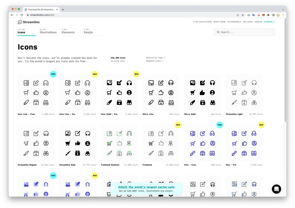 เว็บไซต์ https://www.streamlinehq.com/icons มีทั้งไอคอนแบบเรียบ ๆ และไอคอนที่มีสีสัน สามารถเลือกขนาดและนามสกุลไฟล์ก่อนดาวน์โหลดได้ ถ้าหากอยากกำหนดสีไอคอนก่อนดาวน์โหลดก็สามารถอัปเกรดชำระเงิน เพื่อดาวน์โหลดแบบเต็มรูปแบบ