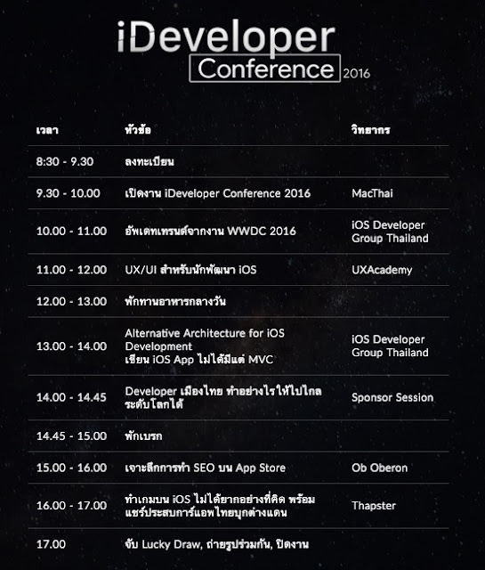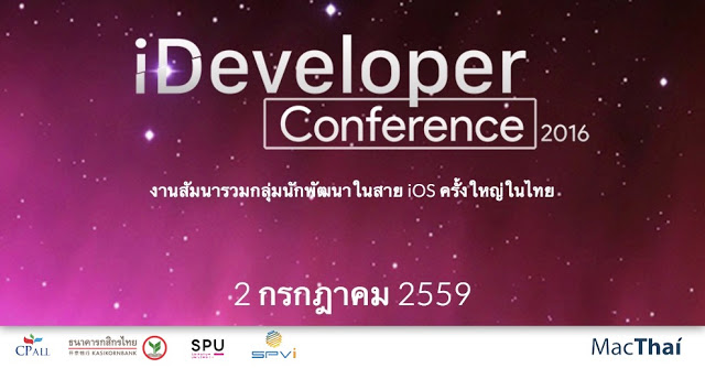 พบกับ iDeveloper Conference 2016 งานรวมกลุ่มนักพัฒนาในสาย iOS ครั้งใหญ่ในไทย ซึ่งเป็นงานที่เน้นเนื้อหาใหม่ล่าสุดจากงาน WWDC ที่ผู้เข้าร่วมงานจะได้รับฟังตั้งแต่การเริ่มต้นจะมีแอปสักตัว ไปจนถึงการออกแบบดีไซน์และการโปรโมทแอปของคุณโดยกูรู เจ้าของแอปชื่อดัง ผู้เชี่ยวชาญที่เป็นที่รู้จักในวงการ