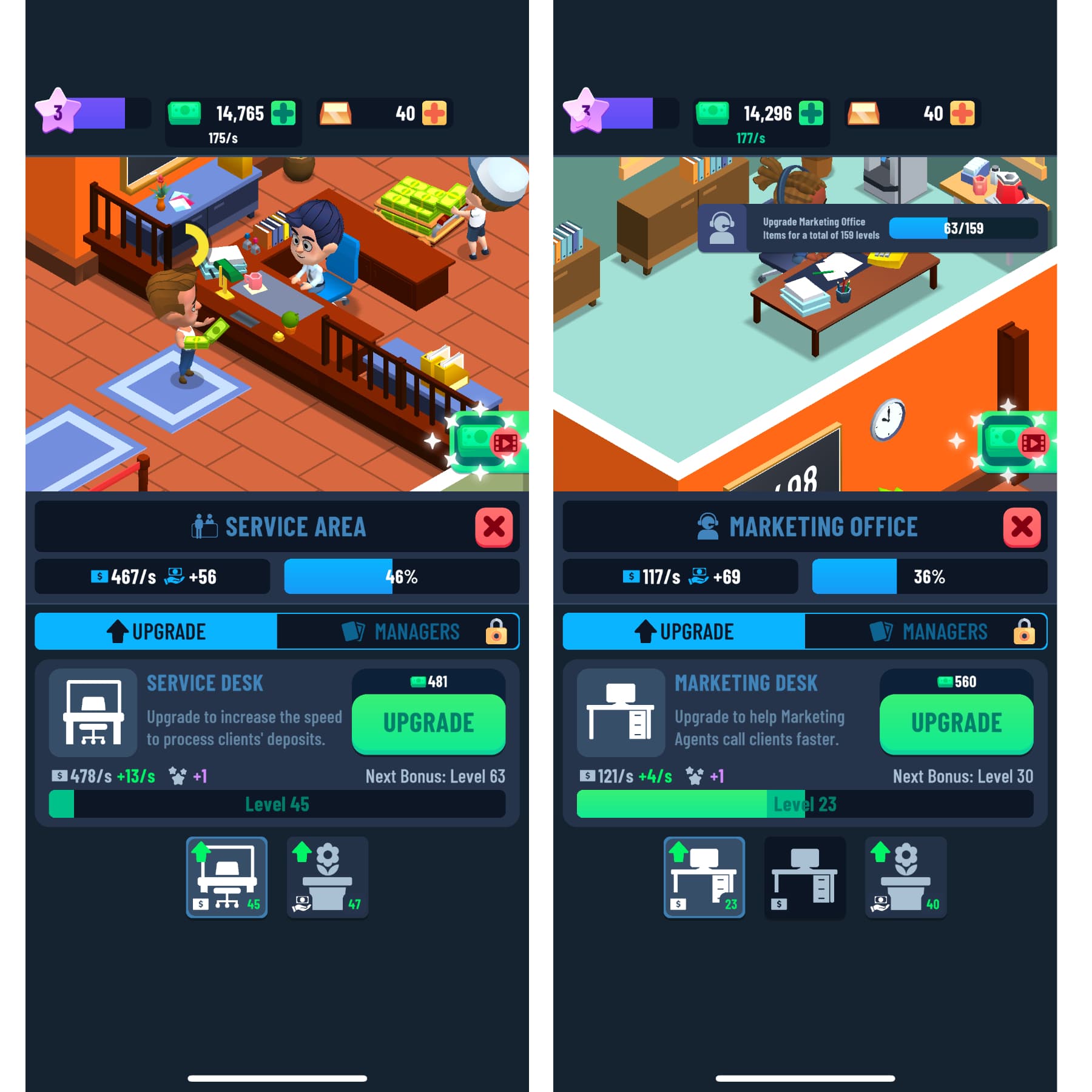 อัปเกรดสิ่งต่าง ๆ ที่อยู่ในธนาคารไปเรื่อย ๆ เช่น อัปเกรดโต๊ะธุรการ โต๊ะการตลาด อัปเกรดตู้เซฟ