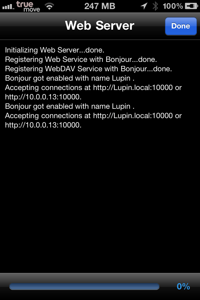 3. เข้า iFile แล้วกดที่รูป Wifi (แถบล่างอันที่ 2)เพื่อเปิด Webserver iFile จะแสดง ip ตามภาพคือ http://10.0.0.13:10000/