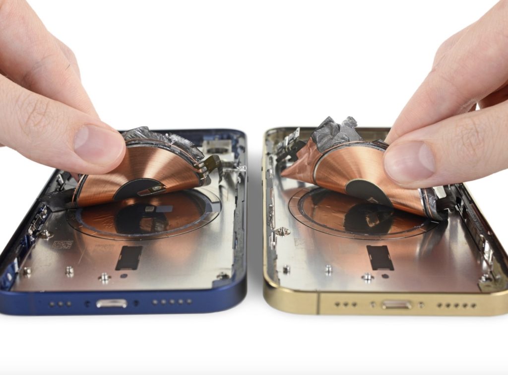 และเมื่อเอกซเรย์เครื่องดูพบว่า Logic Board รูปตัว L มีแม่เหล็กแบบวงกลมที่เกือบจะเหมือนกัน ซึ่งแม่เหล็กนี้ทำให้รองรับการชาร์จร่วมกับ MagSafe ซึ่งการออกแบบเรียบง่ายและขดลวดชาร์จมีลักษณะเป็นวงกลมล้อมรอบแผงวงจรขนาดเล็ก