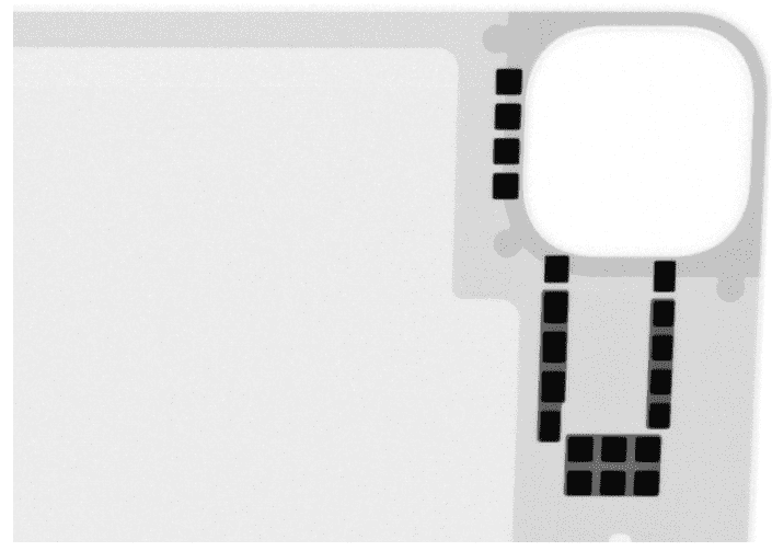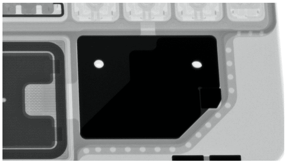 ภาพ X-Ray Magic Keyboard สำหรับ iPad Pro เผยให้เห็นแม่เหล็กจำนวนมากที่ใช้ยึดติดระหว่าง Magic Keyboard กับตัวเครื่อง iPad Pro, โดยที่รอบ ๆ ช่องของกล้องหลังนั้นก็มีแม่เหล็กเหมือนกันเพื่อให้ยึดติดกับเครื่องได้อย่างมั่นคงนั่นเอง