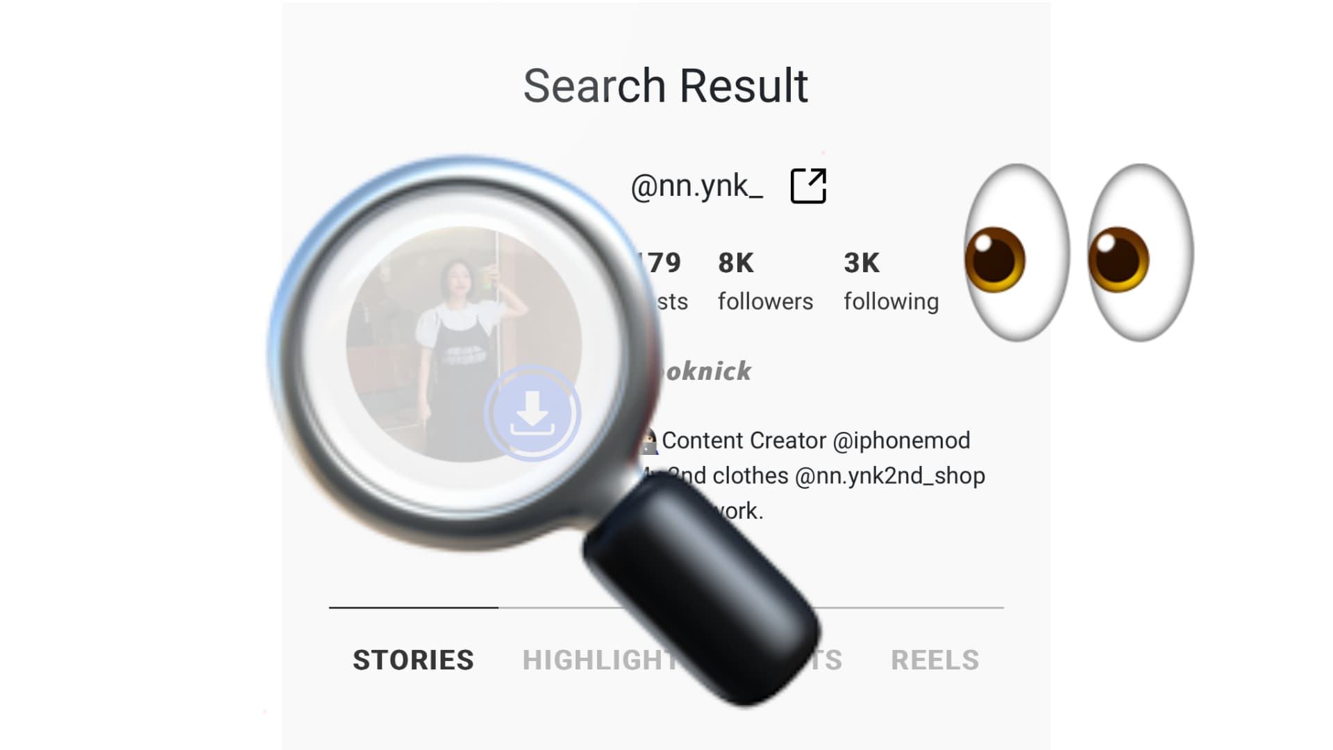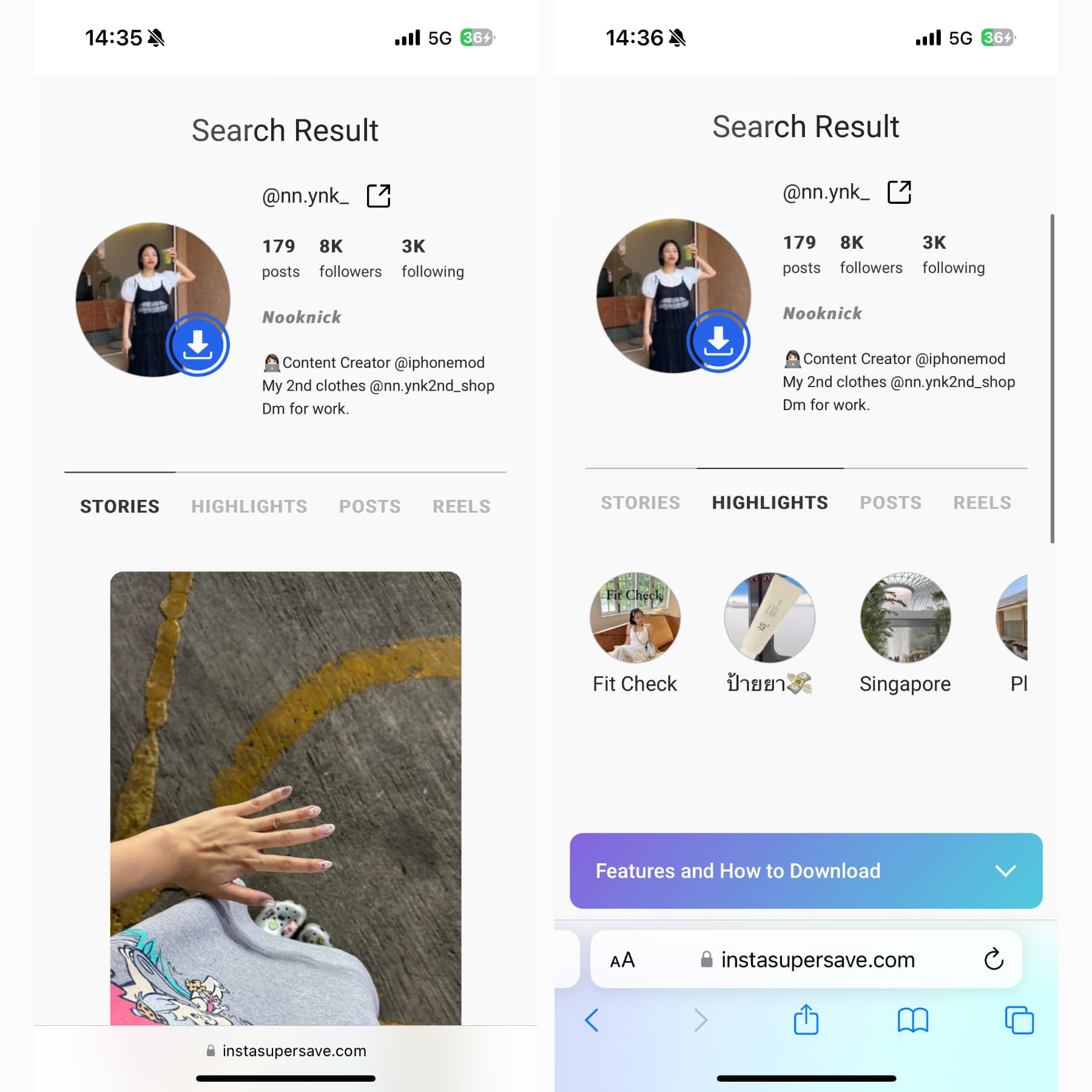รอซักครู่จะมีการโหลดหน้าบัญชีไอจีของคน ๆ นั้นขึ้นมา โดยสามารถเลือกดูได้ทั้งสตอรี่ล่าสุด สตอรี่ไฮไลท์ โพสต์ และคลิป Reels
