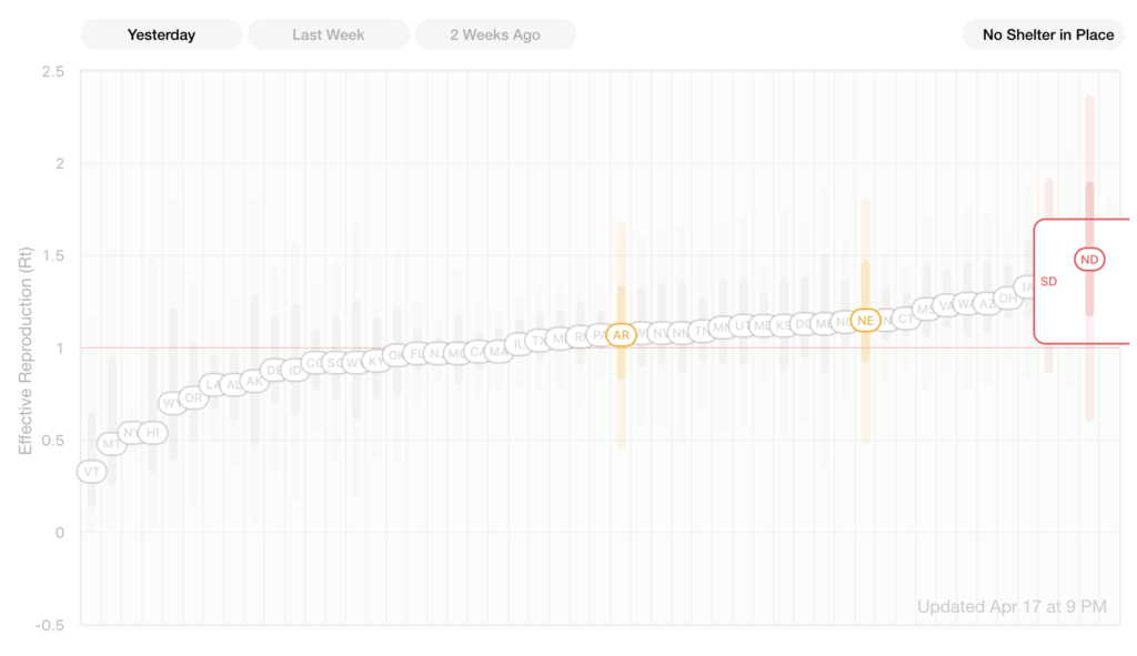ตอนนี้การติดเชื้อไวรัสโคโรน่าสายพันธุ์ใหม่ในสหรัฐอเมริการยังมีตัวเลขที่น่าเป็นห่วงผู้ก่อตั้ง Instagram จึงได้พัฒนา เว็บไซต์ Rt.live ที่เป็นการแสดงแดชบอร์ดตัวชี้วัดการแพร่ระบาดของไวรัสว่ามีอัตราเติบโตอย่างรวดเร็วแค่ไหน เป็นค่าเฉลี่ยของจำนวนคนต่อคนที่ติดเชื้อในแต่ละรัฐ ถ้าหากค่า Rt สูงกว่า 1 หมายความว่าอยู่ในสถานะที่ไวรัสแพร่กระจายอย่างรวดเร็ว และเมื่อค่าต่ำกว่า 1.0 แสดงให้เห็นว่าการติดเชื้อลดลง