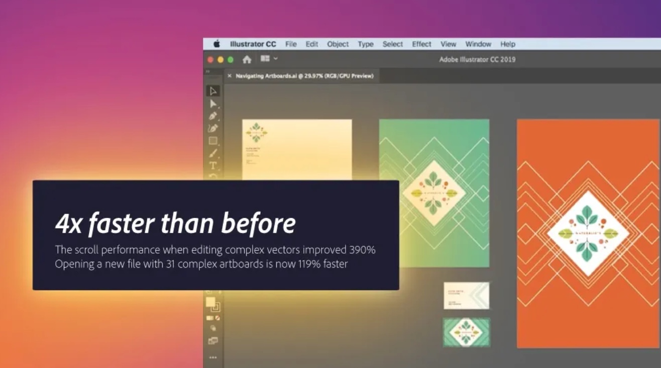- Illustrator : ประสิทธิภาพสูงขึ้น 65%, เปิดแอป สร้างเอกสารเร็วขึ้น 4 เท่า, การเลื่อนการใช้งาน แก้ไข Vector ซับซ้อน ประสิทธิภาพสูงขึ้น 390%, เปิดไฟล์ สร้างไฟล์ ที่มี่ artboard ซับซ้อน 31 งาน เร็วขึ้น 119%