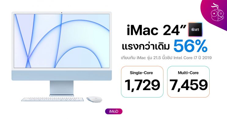 คะแนนประสิทธิภาพของ iMac รุ่น 24 นิ้วชิป M1 สูงกว่า iMac รุ่น 21.5 นิ้วชิป Intel Core i7 ปี 2019 ค่อนข้างมาก โดย iMac รุ่น 21.5 นิ้วชิป Intel ปี 2019 มีคะแนน (เฉลี่ย) Single-Core 1,109 คะแนน และ Multi-Core 6,014 คะแนน ซึ่ง iMac รุ่น 24 นิ้วชิป M1 มีคะแนนประสิทธิภาพสูงกว่า 56% ใน Single-Core และ 24% ใน Multi-Core