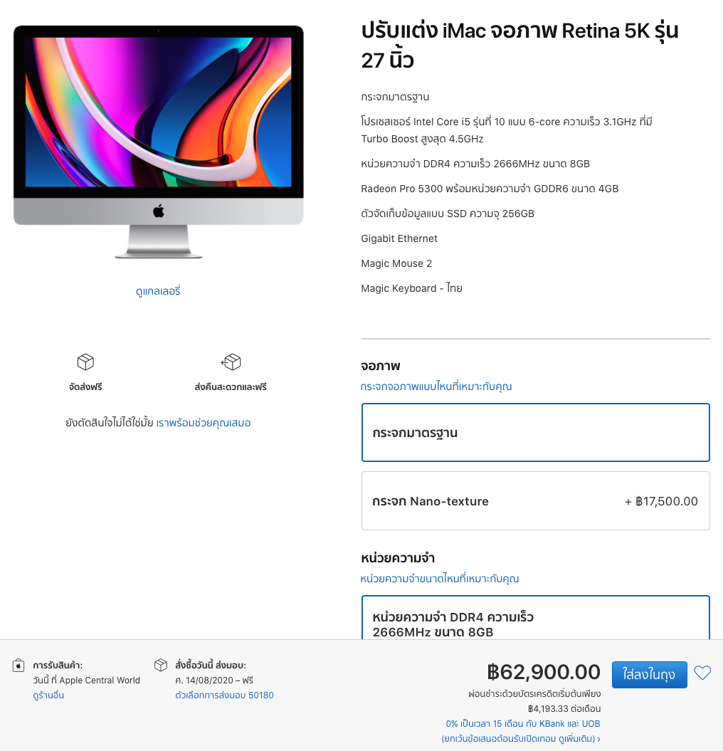 ผู้ซื้อสามารถกดซื้อ iMac รุ่น 27 นิ้ว 2020 แล้วไปรับเครื่องได้แล้วที่ Apple Central World, Apple Iconsiam หรือจะสั่งออนไลน์ส่งมาที่บ้านก็ได้