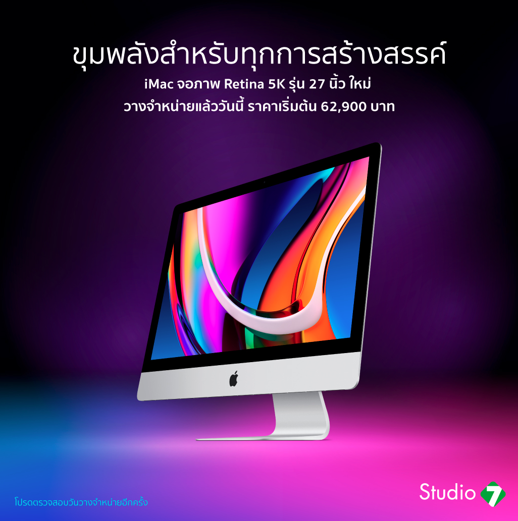 Studio 7 ได้วางจำหน่าย iMac รุ่น 27 นิ้ว 2020 ที่หน้าร้านแล้ว มีโปรโมชั่นผ่อนชำระและส่วนลดพิเศษด้วย ใครสนใจไปที่สาขาใกล้บ้านได้เลย