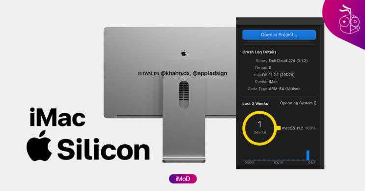 Dennis Oberhoff โพสต์ผ่าน Twitter ระบุถึงข้อมูล iMac รุ่นใหม่ใน Xcode Log ของแอป DaftCloud ซึ่งเป็นแอปสำหรับ macOS โดยมีข้อมูลระบุว่าเป็น iMac ARM-64 ใช้ macOS 11.2.1