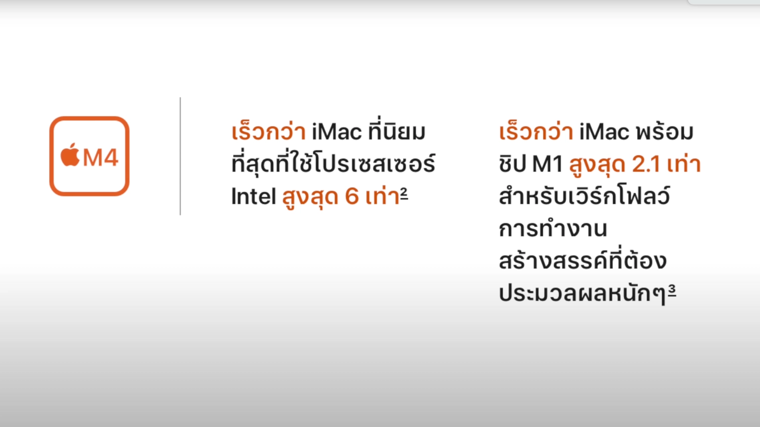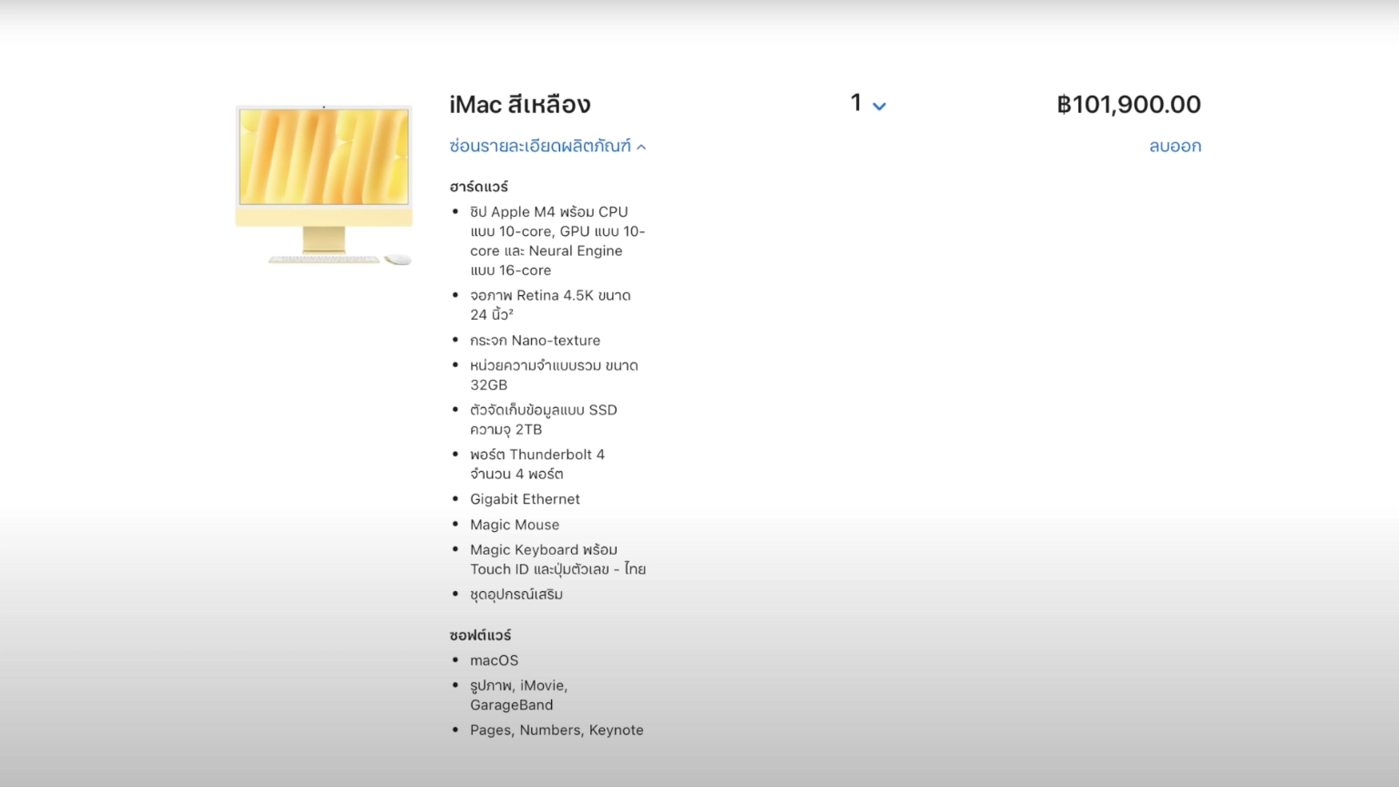 - iMac ชิป M4 CPU 10-core | GPU 10-core | RAM 24GB | SSD 512GB เริ่มต้น 65,900 บาท