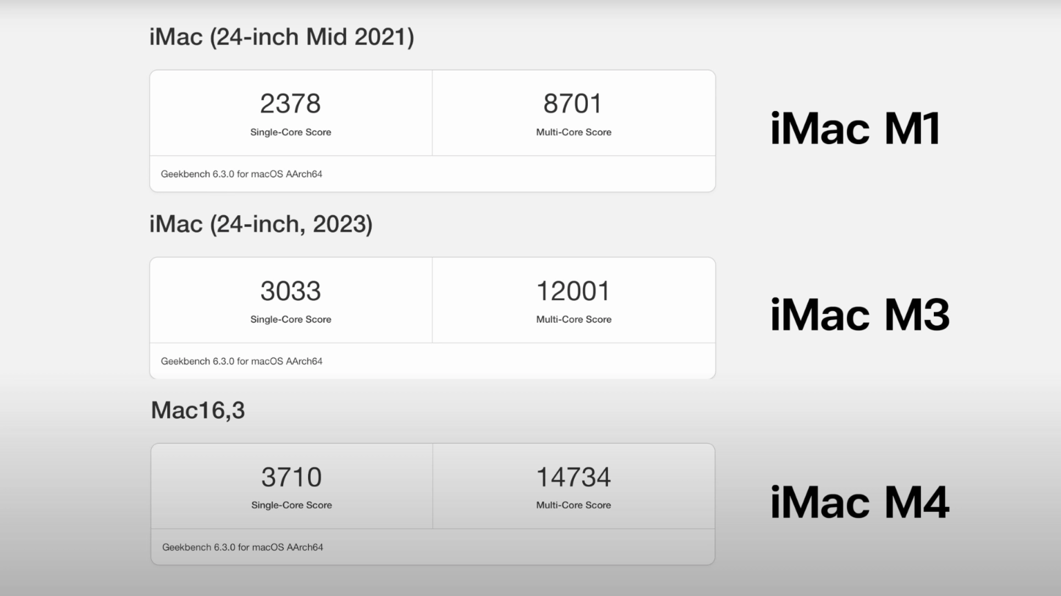 ด้วยการอัปเกรดมาใช้ชิป M4 ให้ประสิทธิภาพโดยรวมเหนือกว่า iMac M1 และ M2 จากคะแนน Geekbench หากดูจากตัวเลขจะเห็นว่าต่างกันไม่มากหากเทียบกับชิป M3 แต่หากเทียบกับชิป M1 ก็จะเห็นความแตกต่างกันค่อนข้างชัด ซึ่งตัวเลขเหล่านี้จะส่งผลต่อการใช้งานจริงไม่มากก็น้อย