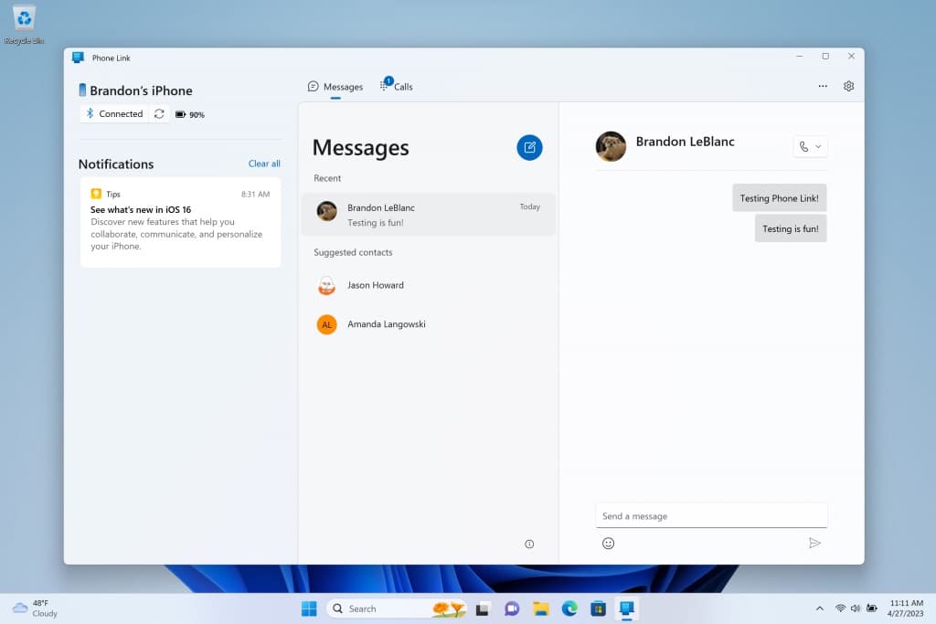 ผู้ใช้สามารถจับคู่ iPhone เข้ากับ PC ผ่านบลูทูธ เมื่ออนุญาตสิทธิ์บางอย่างบน iPhone แล้ว ผู้ใช้จะสามารถส่งและรับ iMessages รวมถึงข้อความ SMS ผ่านแอป “Phone Link” ได้ แต่จะไม่รองรับการแชทเป็นกลุ่มหรือการส่งรูปภาพและวิดีโอ